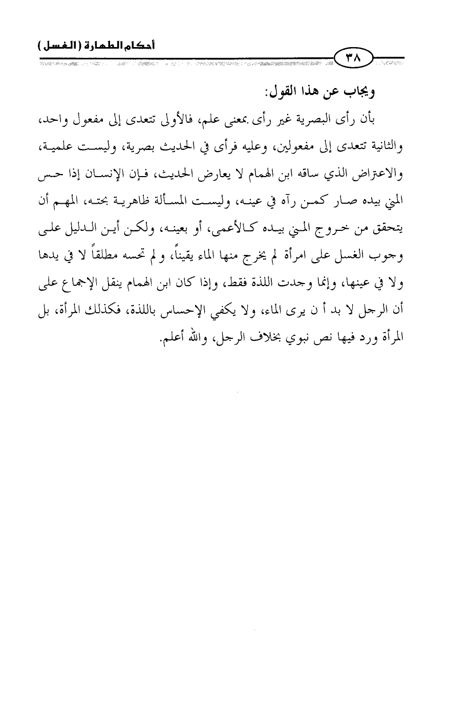 بأن رأى البصرية غير رأى بمعنى علم، فالأولى تتعدى إلى مفعول واحد، والثانية تتعدى إلى مفعولين، وعليه فرأى في الحديث بصرية، وليست علمية، والاعتراض الذي ساقه ابن الهمام لا يعارض الحديث، فإن الإنسان إذا حس المني بيده صار كمن رأه في عينه، وليست المسألة ظاهرية بحته، المهم أن يتحقق من خروج المني بيده كالأعمى، أو بعينه، ولكن أين الدليل على وجوب الغسل على امرأة لم يخرج منها الماء يقيناً، ولم تحسه مطلقاً لا في يدها ولا في عينها، وإنما وجدت اللذة فقط، وإذا كان ابن الهمام ينقل الإجماع على أن الرجل لا بد أن يرى الماء، ولا يكفي الإحساس باللذة، فكذلك المرأة، بل المرأة ورد فيها نص نبوي بخلاف الرجل، والله أعلم.