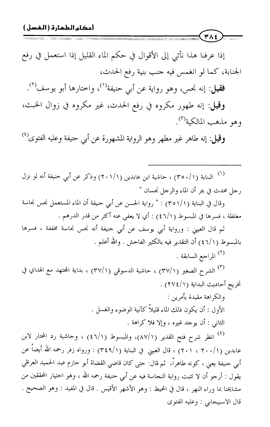 (¬4) انظر شرح فتح القدير (1/ 87)، والمبسوط (1/ 46)، وحاشية رد المحتار لابن عابدين (1/ 200، 201)، قال العيني في البناية (1/ 349): ورواه زفر رحمه الله أيضاً عن أبي حنيفة يعني، كونه طاهراً، ثم قال: حتى كان قاضي القضاة أبو حازم عبد الحميد العراقي يقول: ارجو أن لا تثبت رواية النجاسة فيه عن أبي حنيفة رحمه الله، وهو اختيار المحققين من مشايخنا بما وراء النهر، قال في المحيط: وهو الأشهر الأقيس. قال في المفيد: وهو الصحيح. قال الاسبيجابي: وعليه الفتوى.