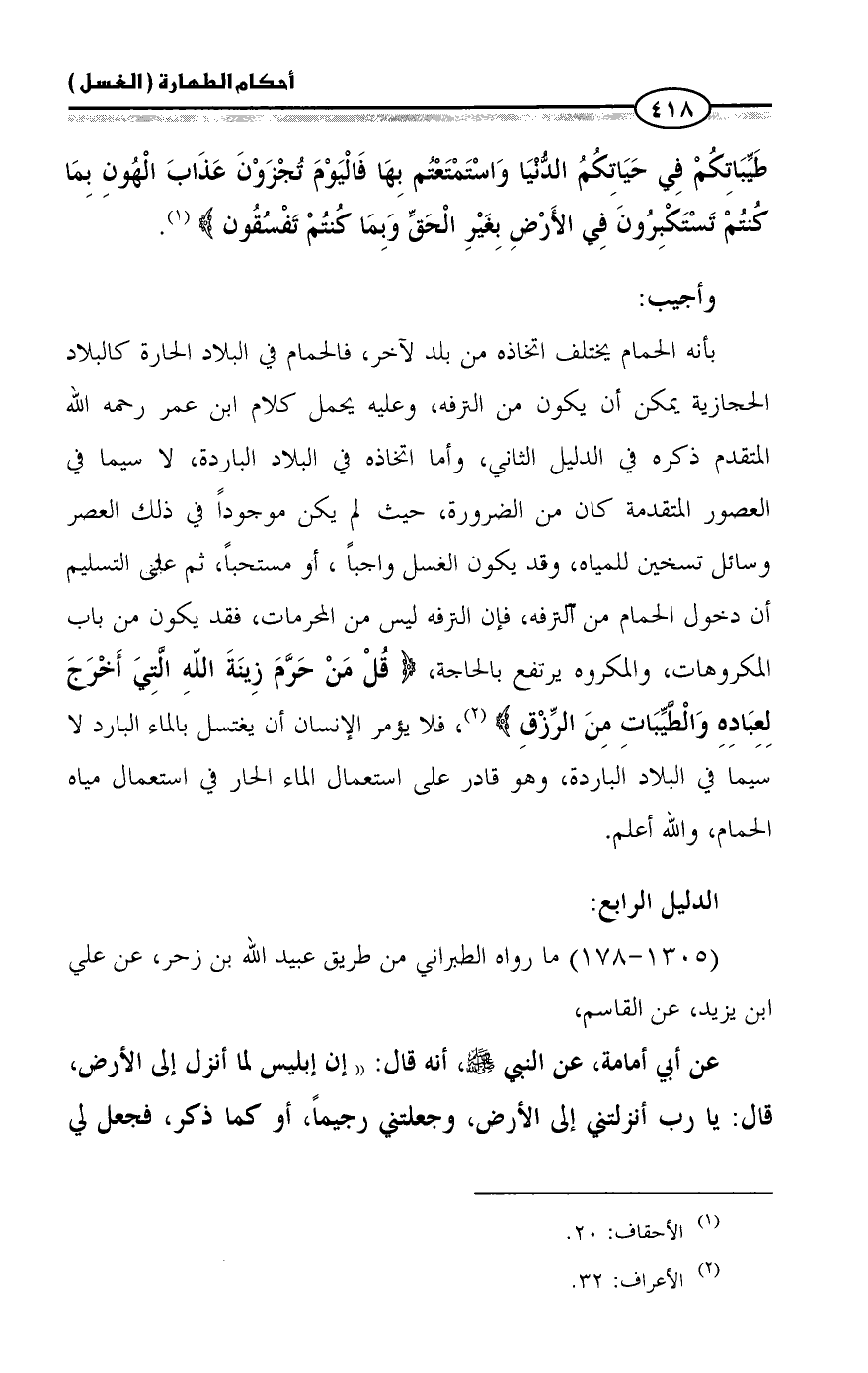 بأنه الحمام يختلف اتخاذه من بلد لآخر، فالحمام في البلاد الحارة كالبلاد الحجازية يمكن أن يكون من الترفه، وعليه يحمل كلام ابن عمر رحمه الله المتقدم ذكره في الدليل الثاني، وأما اتخاذه في البلاد الباردة، لا سيما في العصور المتقدمة كان من الضرورة، حيث لم يكن موجوداً في ذلك العصر وسائل تسخين للمياه، وقد يكون الغسل واجباً، أو مستحباً، ثم على التسليم أن دخول الحمام من الترفه، فإن الترفه ليس من المحرمات، فقد يكون من باب المكروهات، والمكروه يرتفع بالحاجة، {قل من حرم زينة الله التي أخرج لعباده والطيبات من الرزق} (¬2)، فلا يؤمر الإنسان أن يغتسل بالماء البارد لا سيما في البلاد الباردة، وهو قادر على استعمال الماء الحار في استعمال مياه الحمام، والله أعلم.