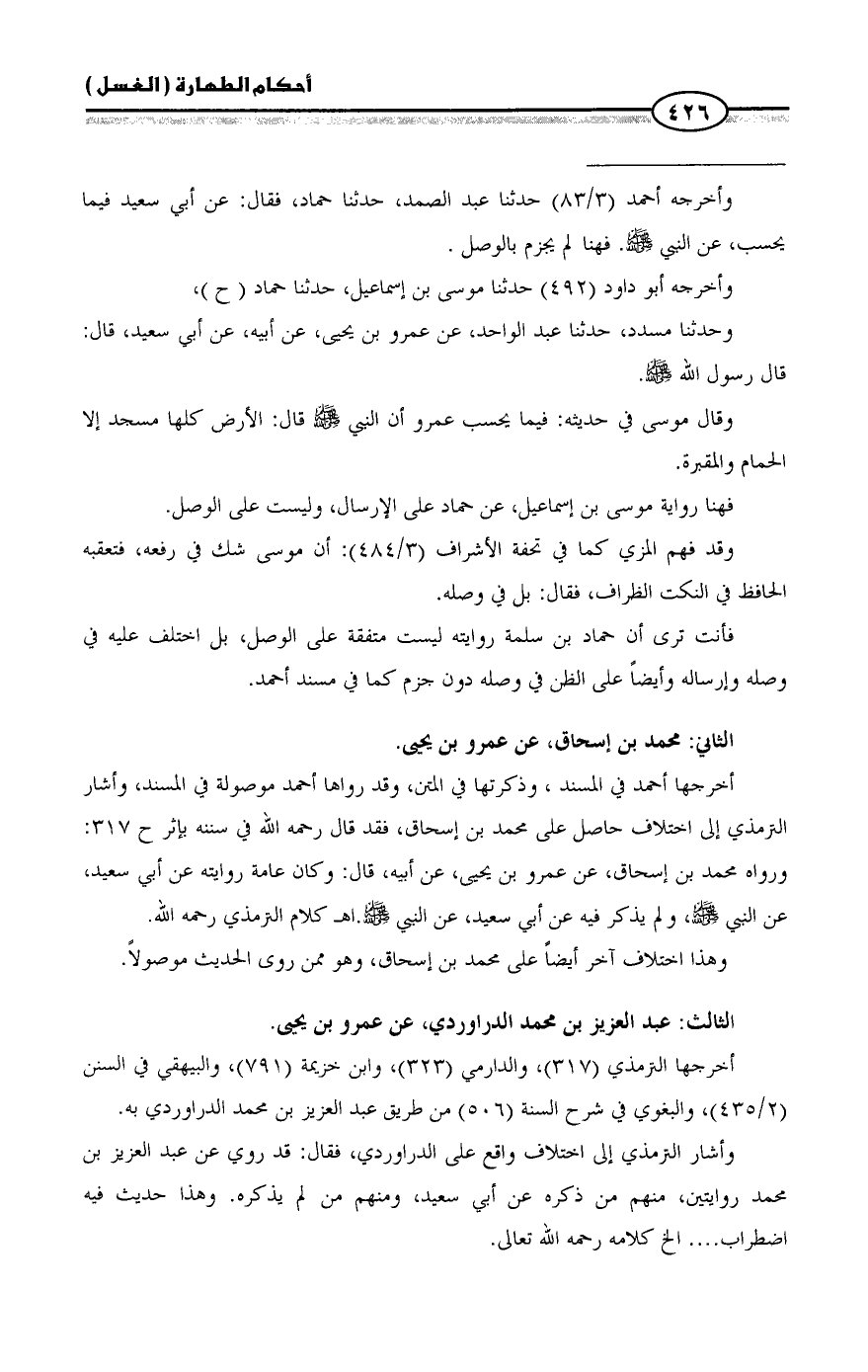 أخرجها أحمد في المسند، وذكرتها في المتن، وقد رواها أحمد موصولة في المسند، وأشار الترمذي إلى اختلاف حاصل على محمد بن إسحاق، فقد قال رحمه الله في سننه بإثر ح 317: ورواه محمد بن إسحاق، عن عمرو بن يحيى، عن أبيه، قال: وكان عامة روايته عن أبي سعيد، عن النبي - صلى الله عليه وسلم -، ولم يذكر فيه عن أبي سعيد، عن النبي - صلى الله عليه وسلم -. اهـ كلام الترمذي رحمه الله.