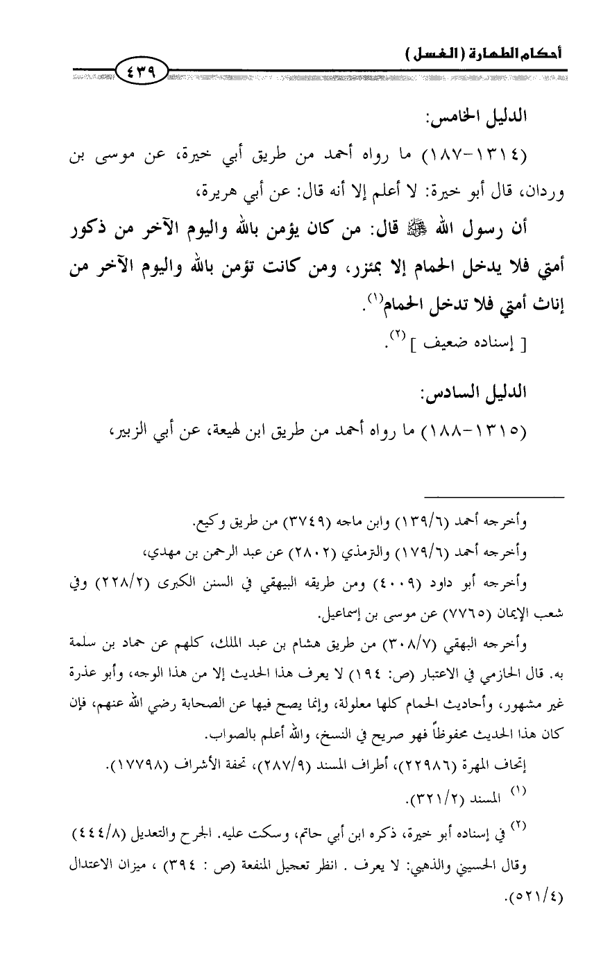 وأخرجه البهقي (7/ 308) من طريق هشام بن عبد الملك، كلهم عن حماد بن سلمة به. قال الحازمي في الاعتبار (ص: 194) لا يعرف هذا الحديث إلا من هذا الوجه، وأبو عذرة غير مشهور، وأحاديث الحمام كلها معلولة، وإنما يصح فيها عن الصحابة رضي الله عنهم، فإن كان هذا الحديث محفوظاً فهو صريح في النسخ، والله أعلم بالصواب.