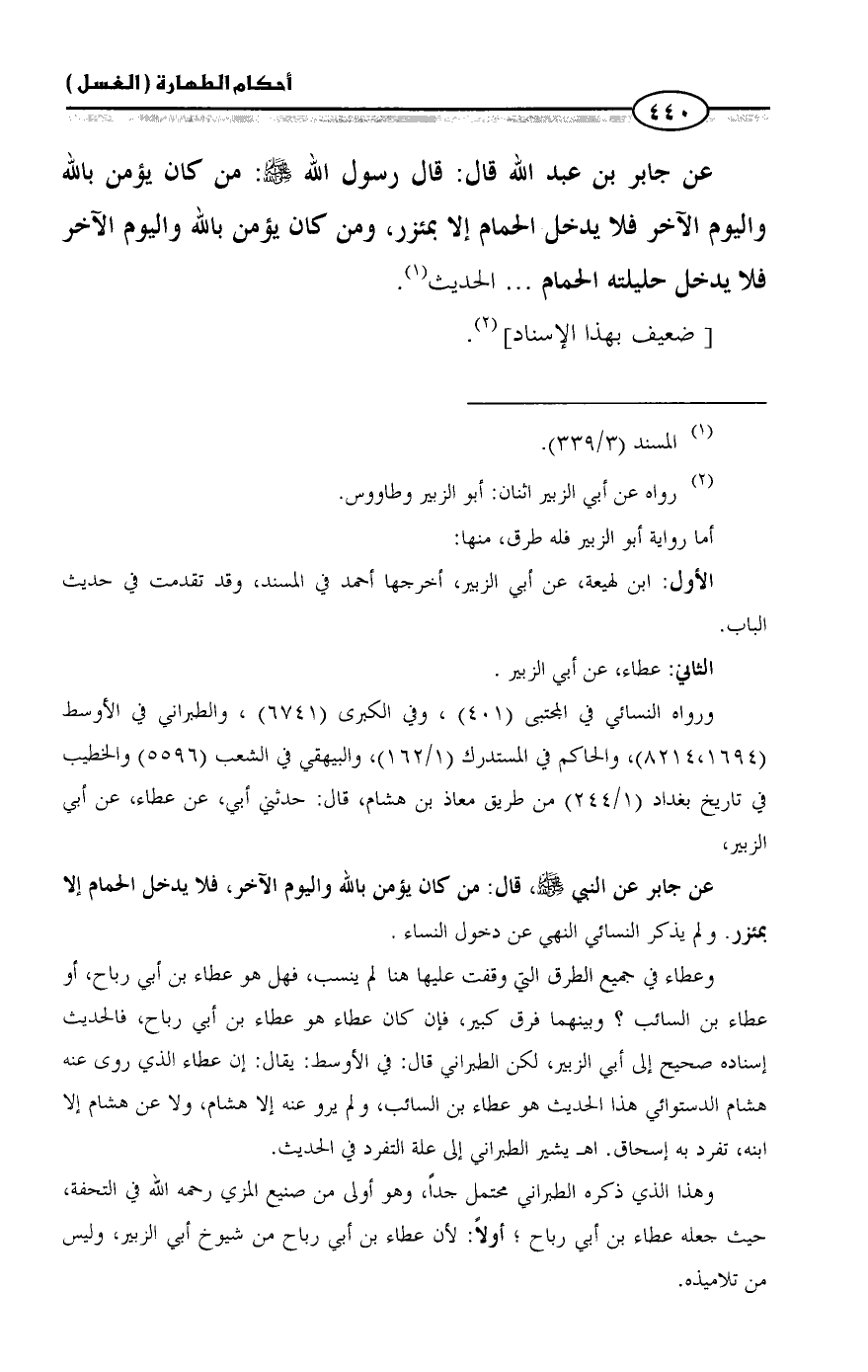 عن جابر عن النبي - صلى الله عليه وسلم -، قال: من كان يؤمن بالله واليوم الآخر، فلا يدخل الحمام إلا بمئزر. ولم يذكر النسائي النهي عن دخول النساء.
