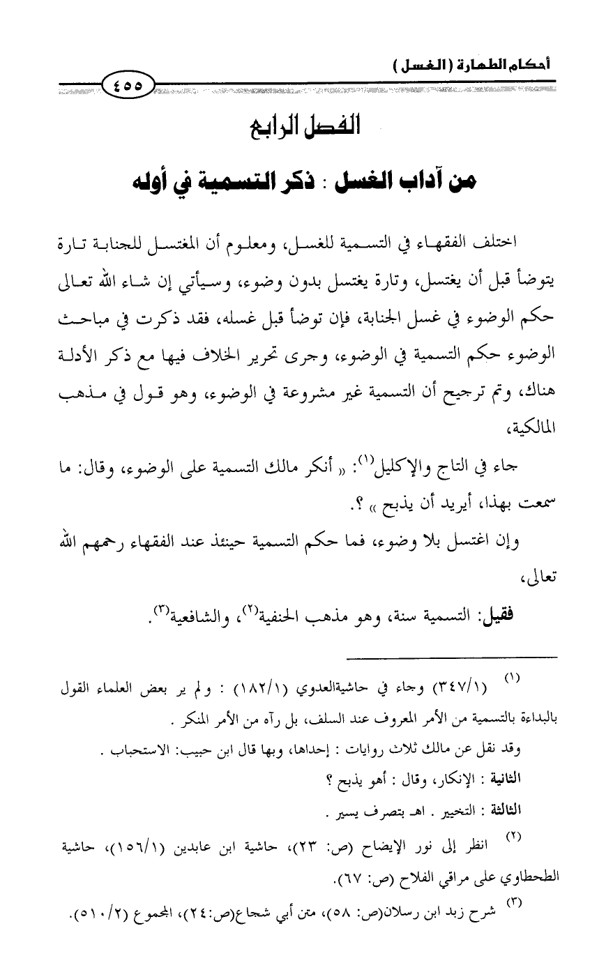 (¬1) (1/ 347) وجاء في حاشيةالعدوي (1/ 182): ولم ير بعض العلماء القول بالبداءة بالتسمية من الأمر المعروف عند السلف، بل رآه من الأمر المنكر.