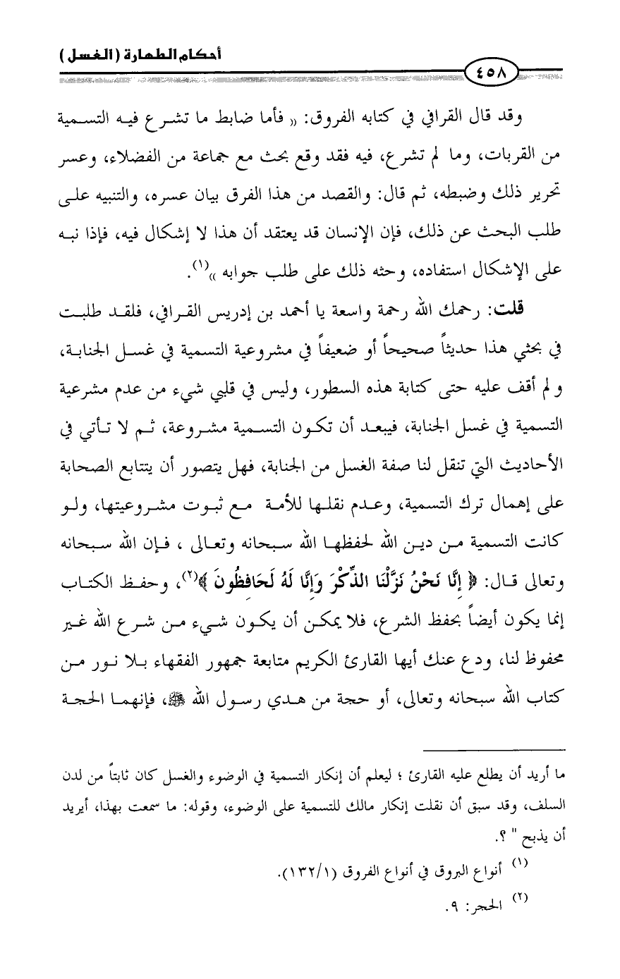 قلت: رحمك الله رحمة واسعة يا أحمد بن إدريس القرافي، فلقد طلبت في بحثي هذا حديثاً صحيحاً أو ضعيفاً في مشروعية التسمية في غسل الجنابة، ولم أقف عليه حتى كتابة هذه السطور، وليس في قلبي شيء من عدم مشرعية التسمية في غسل الجنابة، فيبعد أن تكون التسمية مشروعة، ثم لا تأتي في الأحاديث التي تنقل لنا صفة الغسل من الجنابة، فهل يتصور أن يتتابع الصحابة على إهمال ترك التسمية، وعدم نقلها للأمة مع ثبوت مشروعيتها، ولو كانت التسمية من دين الله لحفظها الله سبحانه وتعالى، فإن الله سبحانه وتعالى قال: {إنا نحن نزلنا الذكر وإنا له لحافظون} (¬2)، وحفظ الكتاب إنما يكون أيضاً بحفظ الشرع، فلا يمكن أن يكون شيء من شرع الله غير محفوظ لنا، ودع عنك أيها القارئ الكريم متابعة جمهور الفقهاء بلا نور من كتاب الله سبحانه وتعالى، أو حجة من هدي رسول الله - صلى الله عليه وسلم -، فإنهما الحجة