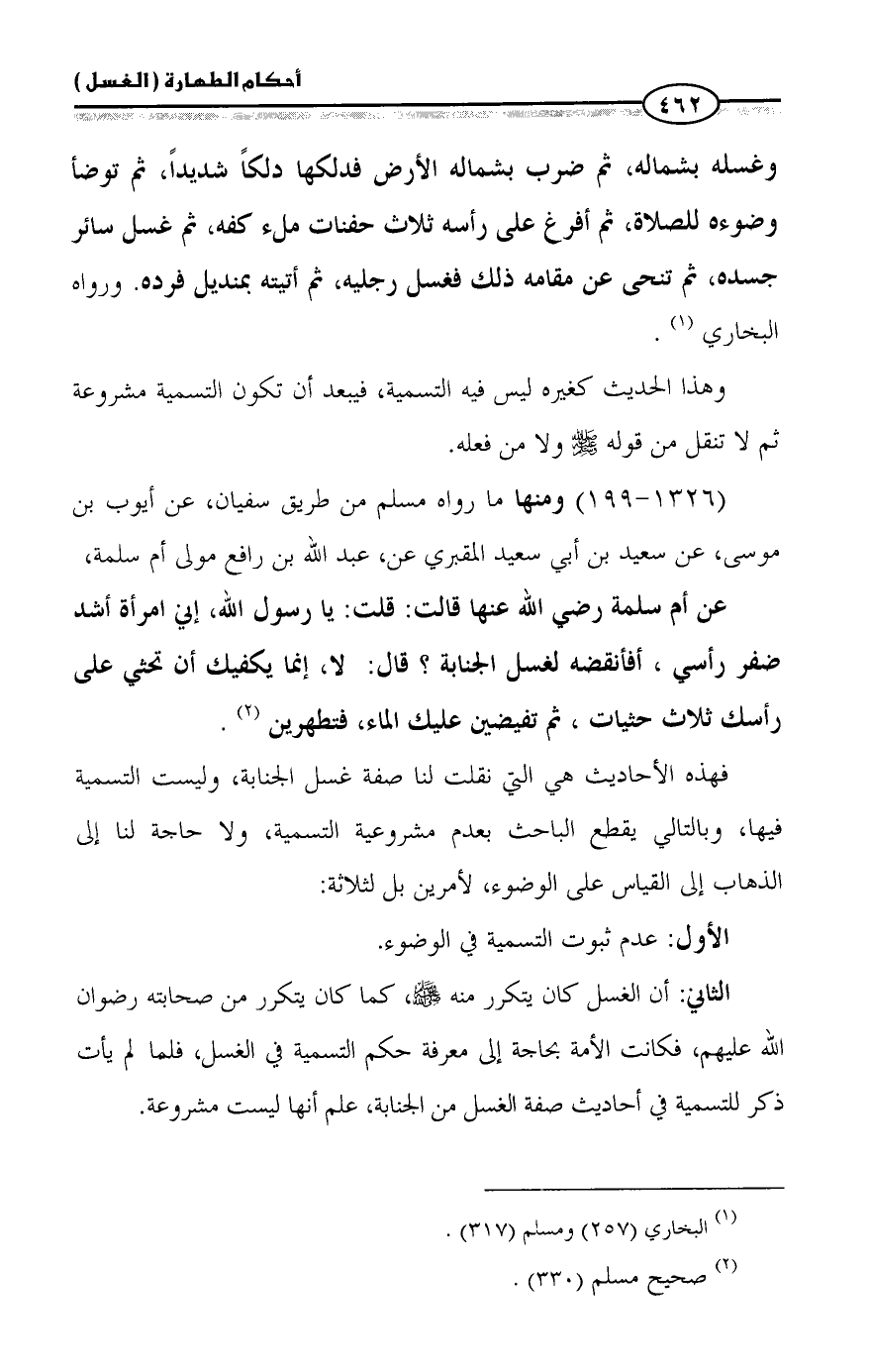 الثاني: أن الغسل كان يتكرر منه - صلى الله عليه وسلم -، كما كان يتكرر من صحابته رضوان الله عليهم، فكانت الأمة بحاجة إلى معرفة حكم التسمية في الغسل، فلما لم يأت ذكر للتسمية في أحاديث صفة الغسل من الجنابة، علم أنها ليست مشروعة.