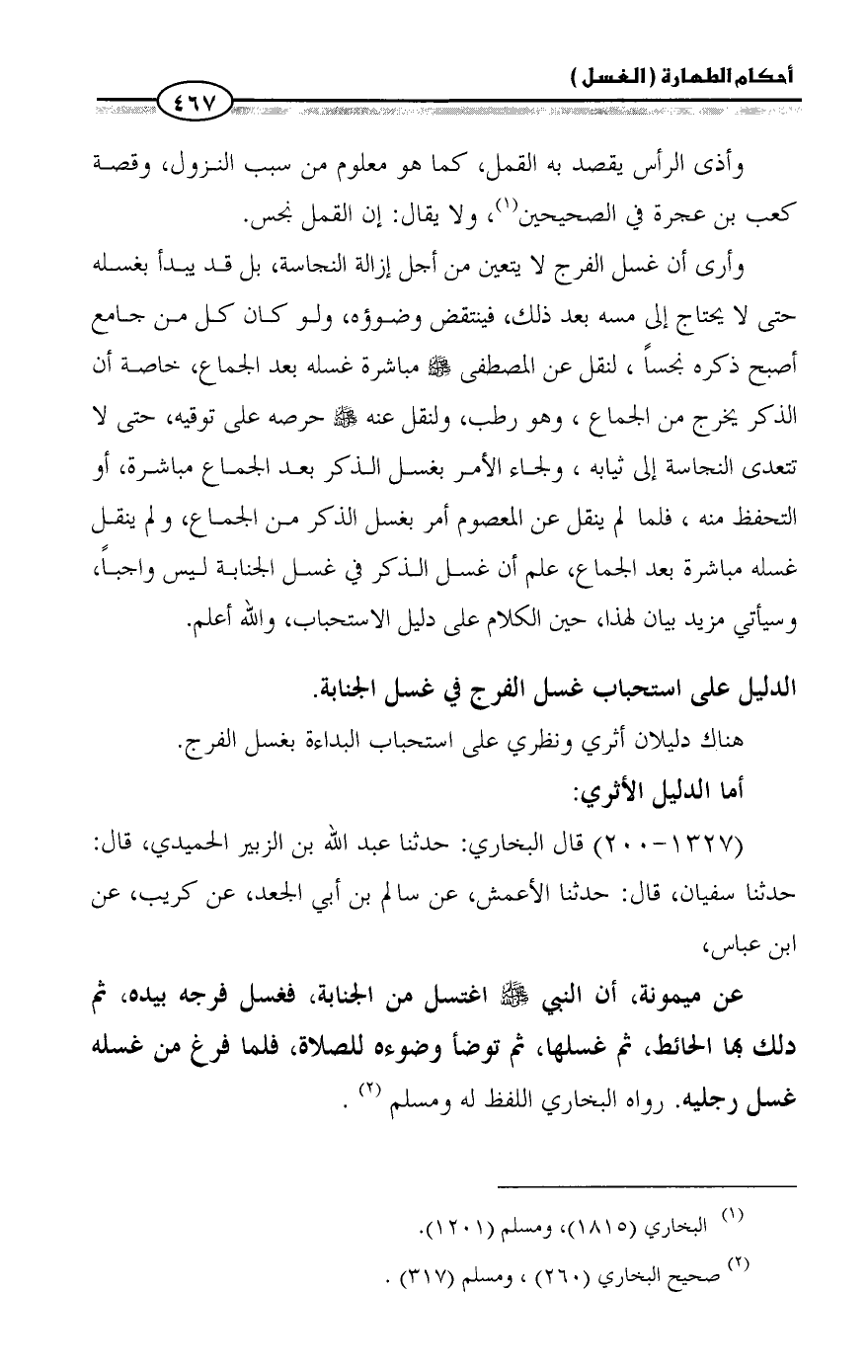 وأرى أن غسل الفرج لا يتعين من أجل إزالة النجاسة، بل قد يبدأ بغسله حتى لا يحتاج إلى مسه بعد ذلك، فينتقض وضوؤه، ولو كان كل من جامع أصبح ذكره نجساً، لنقل عن المصطفى - صلى الله عليه وسلم - مباشرة غسله بعد الجماع، خاصة أن الذكر يخرج من الجماع، وهو رطب، ولنقل عنه - صلى الله عليه وسلم - حرصه على توقيه، حتى لا تتعدى النجاسة إلى ثيابه، ولجاء الأمر بغسل الذكر بعد الجماع مباشرة، أو التحفظ منه، فلما لم ينقل عن المعصوم أمر بغسل الذكر من الجماع، ولم ينقل غسله مباشرة بعد الجماع، علم أن غسل الذكر في غسل الجنابة ليس واجباً، وسيأتي مزيد بيان لهذا، حين الكلام على دليل الاستحباب، والله أعلم.