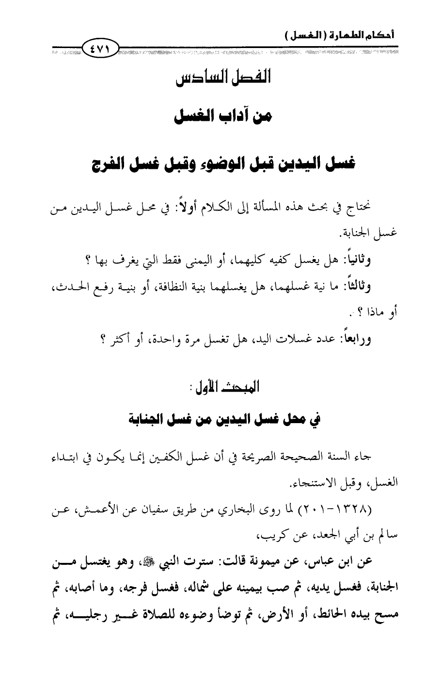 نحتاج في بحث هذه المسألة إلى الكلام أولاً: في محل غسل اليدين من غسل الجنابة.