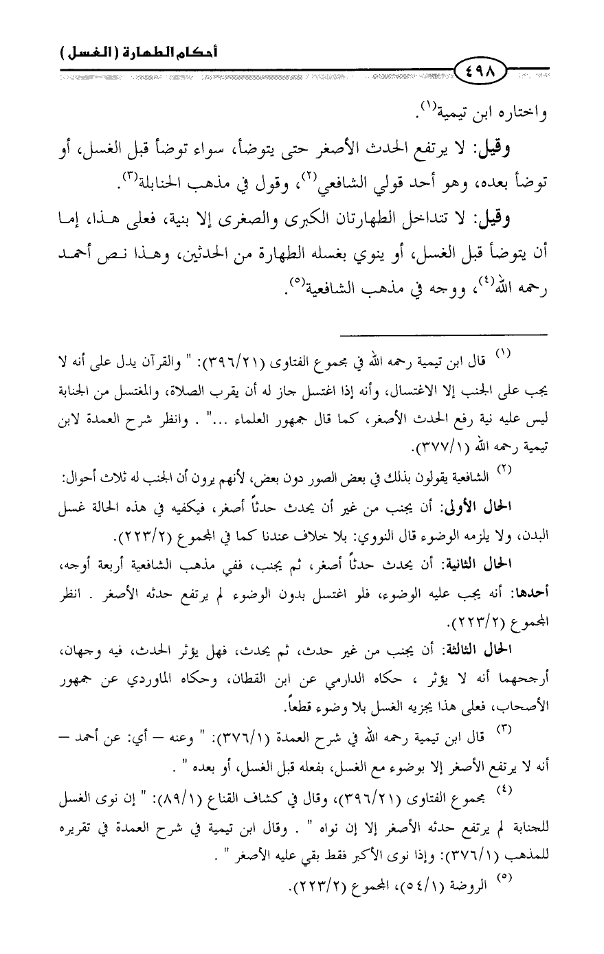 (¬4) مجموع الفتاوى (21/ 396)، وقال في كشاف القناع (1/ 89): " إن نوى الغسل للجنابة لم يرتفع حدثه الأصغر إلا إن نواه ". وقال ابن تيمية في شرح العمدة في تقريره للمذهب (1/ 376): وإذا نوى الأكبر فقط بقي عليه الأصغر ".