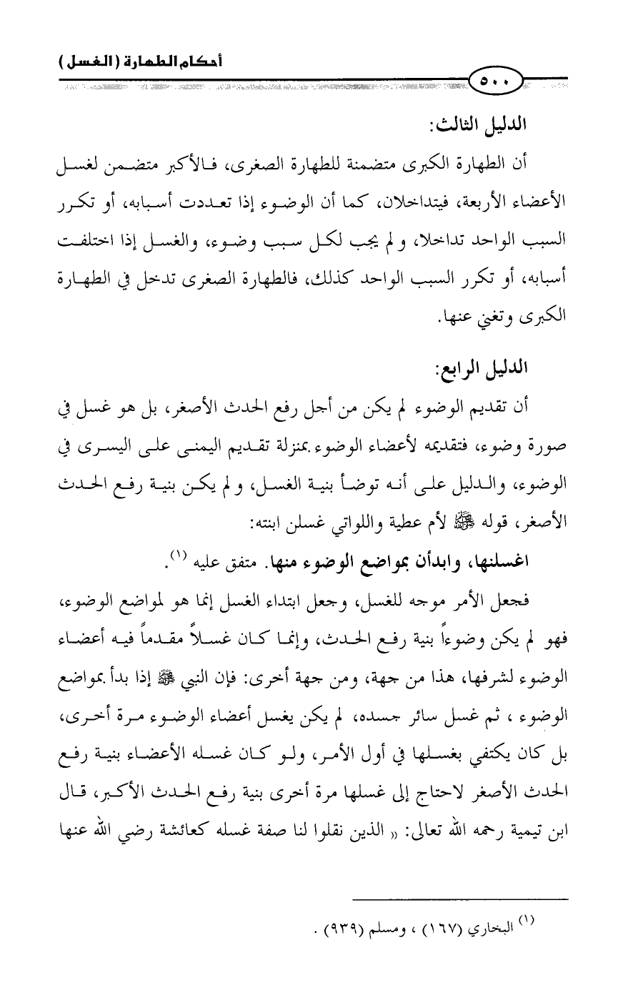فجعل الأمر موجه للغسل، وجعل ابتداء الغسل إنما هو لمواضع الوضوء، فهو لم يكن وضوءاً بنية رفع الحدث، وإنما كان غسلاً مقدماً فيه أعضاء الوضوء لشرفها، هذا من جهة، ومن جهة أخرى: فإن النبي - صلى الله عليه وسلم - إذا بدأ بمواضع الوضوء، ثم غسل سائر جسده، لم يكن يغسل أعضاء الوضوء مرة أخرى، بل كان يكتفي بغسلها في أول الأمر، ولو كان غسله الأعضاء بنية رفع الحدث الأصغر لاحتاج إلى غسلها مرة أخرى بنية رفع الحدث الأكبر، قال ابن تيمية رحمه الله تعالى: ((الذين نقلوا لنا صفة غسله كعائشة رضي الله عنها