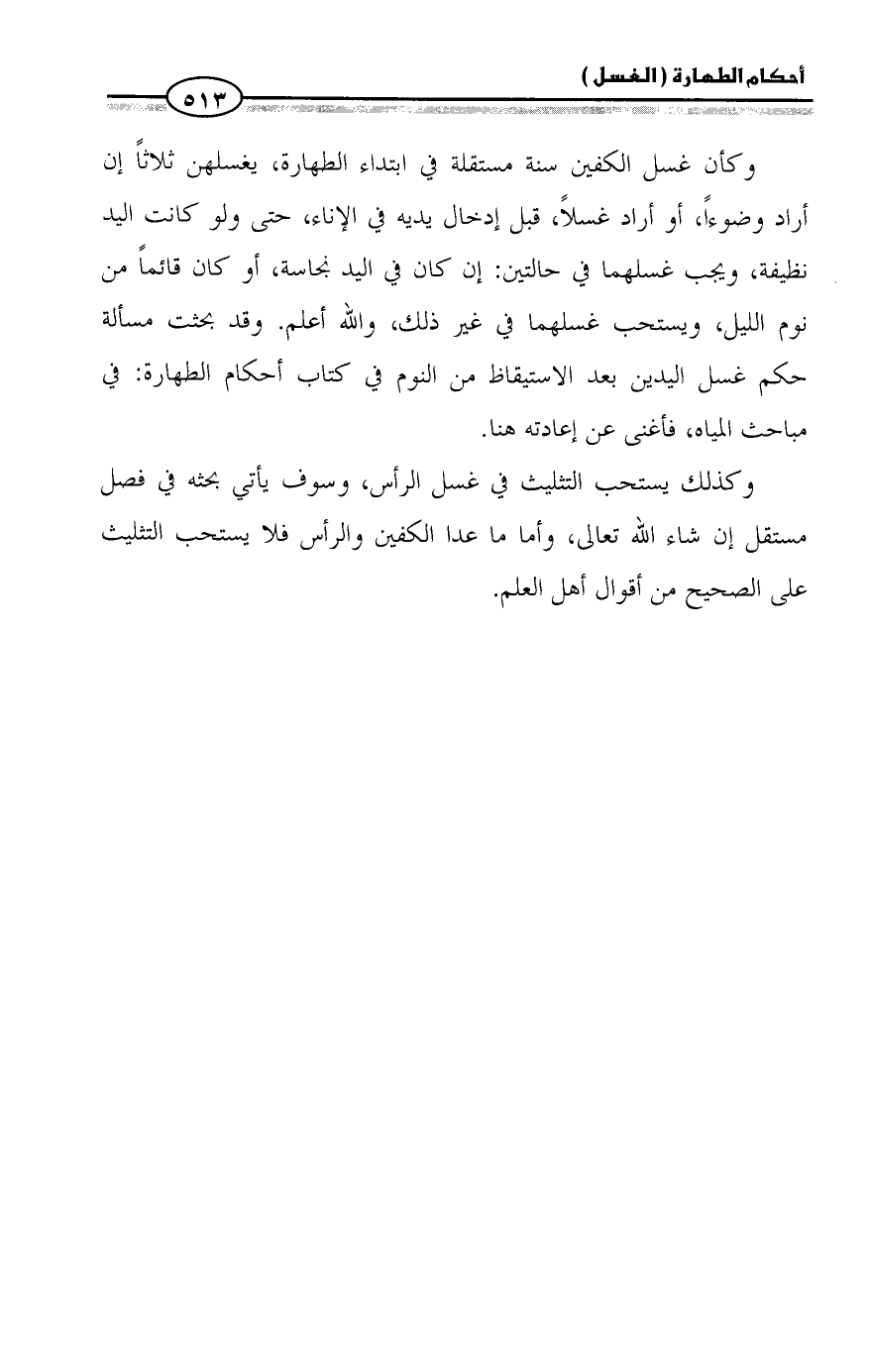 وكذلك يستحب التثليث في غسل الرأس، وسوف يأتي بحثه في فصل مستقل إن شاء الله تعالى، وأما ما عدا الكفين والرأس فلا يستحب التثليث على الصحيح من أقوال أهل العلم.