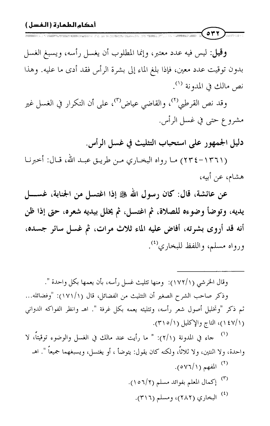 وقد نص القرطبي (¬2)، والقاضي عياض (¬3)، على أن التكرار في الغسل غير مشروع حتى في غسل الرأس.