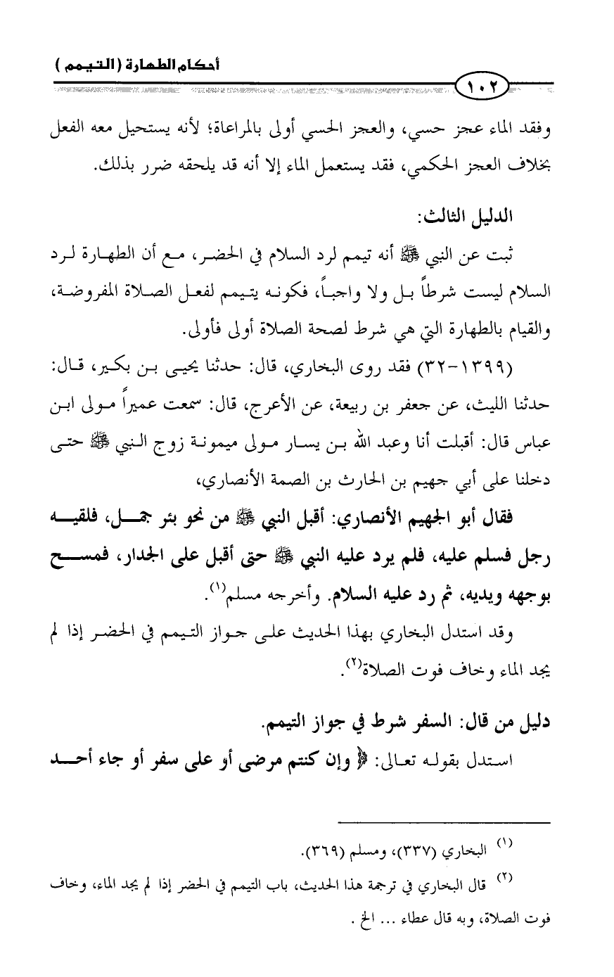 فقال أبو الجهيم الأنصاري: أقبل النبي - صلى الله عليه وسلم - من نحو بئر جمل، فلقيه رجل فسلم عليه، فلم يرد عليه النبي - صلى الله عليه وسلم - حتى أقبل على الجدار، فمسح بوجهه ويديه، ثم رد عليه السلام. وأخرجه مسلم (¬1).