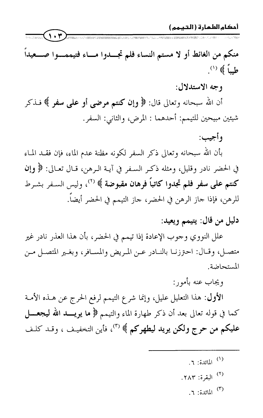 بأن الله سبحانه وتعالى ذكر السفر لكونه مظنة عدم الماء، فإن فقد الماء في الحضر نادر وقليل، ومثله ذكر السفر في آية الرهن، قال تعالى: {وإن كنتم على سفر فلم تجدوا كاتباً فرهان مقبوضة} (¬2)، وليس السفر بشرط للرهن، فإذا جاز الرهن في الحضر، جاز التيمم في الحضر أيضاً.