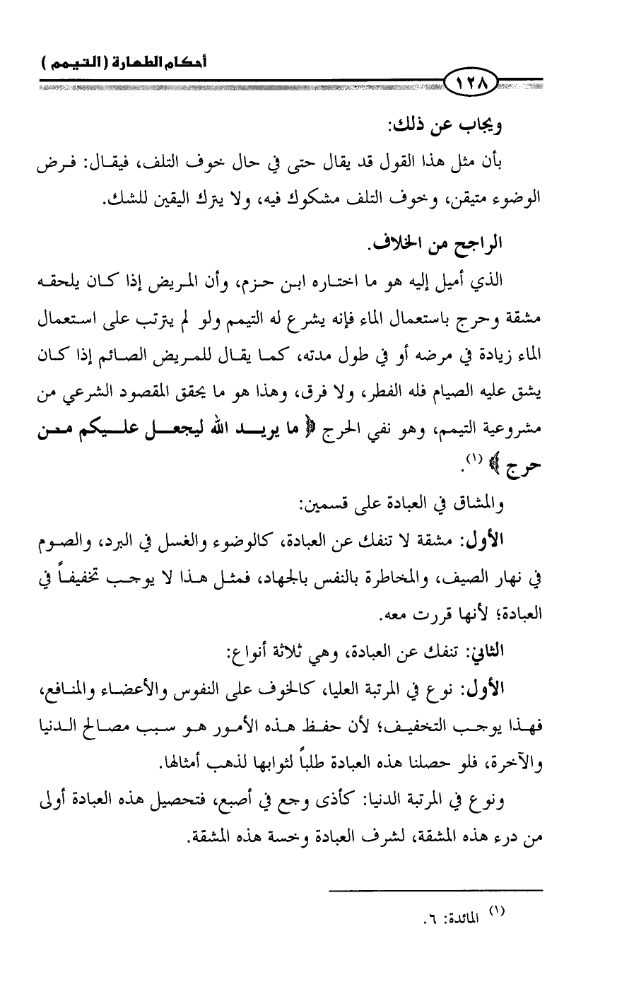الذي أميل إليه هو ما اختاره ابن حزم، وأن المريض إذا كان يلحقه مشقة وحرج باستعمال الماء فإنه يشرع له التيمم ولو لم يترتب على استعمال الماء زيادة في مرضه أو في طول مدته، كما يقال للمريض الصائم إذا كان يشق عليه الصيام فله الفطر، ولا فرق، وهذا هو ما يحقق المقصود الشرعي من مشروعية التيمم، وهو نفي الحرج {ما يريد الله ليجعل عليكم من