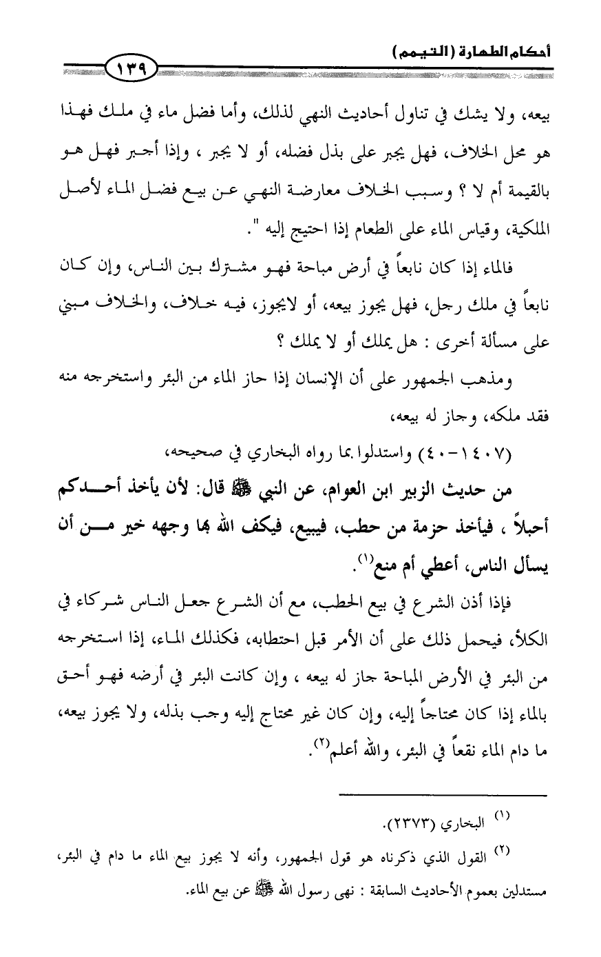 فإذا أذن الشرع في بيع الحطب، مع أن الشرع جعل الناس شركاء في الكلأ، فيحمل ذلك على أن الأمر قبل احتطابه، فكذلك الماء، إذا استخرجه من البئر في الأرض المباحة جاز له بيعه، وإن كانت البئر في أرضه فهو أحق بالماء إذا كان محتاجاً إليه، وإن كان غير محتاج إليه وجب بذله، ولا يجوز بيعه، ما دام الماء نقعاً في البئر، والله أعلم (¬2).