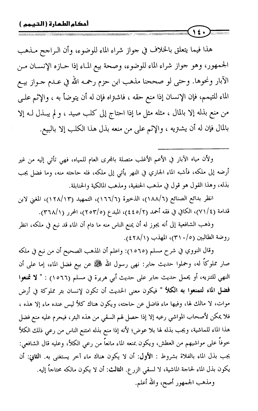 وقال النووي في شرح مسلم (1565): واعلم أن المذهب الصحيح أن من نبع في ملكه صار مملوكاً له، وحملوا حديث جابر: نهى رسول الله - صلى الله عليه وسلم - عن بيع فضل الماء، إما على أن النهي للتنزيه، أو يحمل حديث جابر على حديث أبي هريرة في مسلم (1566): " لا تمنعوا فضل الماء لتمنعوا به الكلأ " فيكون معنى الحديث أن تكون لإنسان بئر مملوكة في أرض موات، لا مالك لها، وفيها ماء فاضل عن حاجته، ويكون هناك كلأ ليس عنده ماء إلا هذه، فلا يمكن لأصحاب المواشي رعيه إلا إذا حصل لهم السقي من هذه البئر، فيحرم عليه منع فضل هذا الماء للماشية، ويجب بذله لها بلا عوض؛ لأنه إذا منع بذله امتنع الناس من رعي ذلك الكلأ خوفاً على مواشيهم من العطش، ويكون بمنعه الماء مانعاً من رعي الكلأ، وعليه قال الشافعي: يجب بذل الماء بالفلاة بشروط: الأول: أن لا يكون هناك ماء آخر يستغنى به. الثاني: أن يكون بذل الماء لحاجة الماشية، لا لسقي الزرع. الثالث: أن لا يكون مالكه محتاجاً إليه.