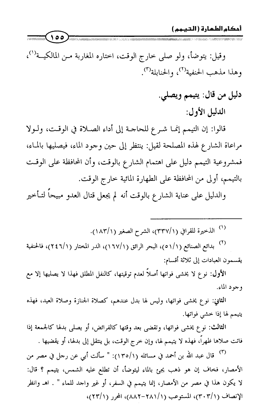 (¬3) قال عبد الله بن أحمد في مسائله (1/ 135): " سألت أبي عن رجل في مصر من الأمصار، فخاف إن هو ذهب يجئ بالماء ليتوضأ، أن تطلع عليه الشمس، يتيمم؟ قال: