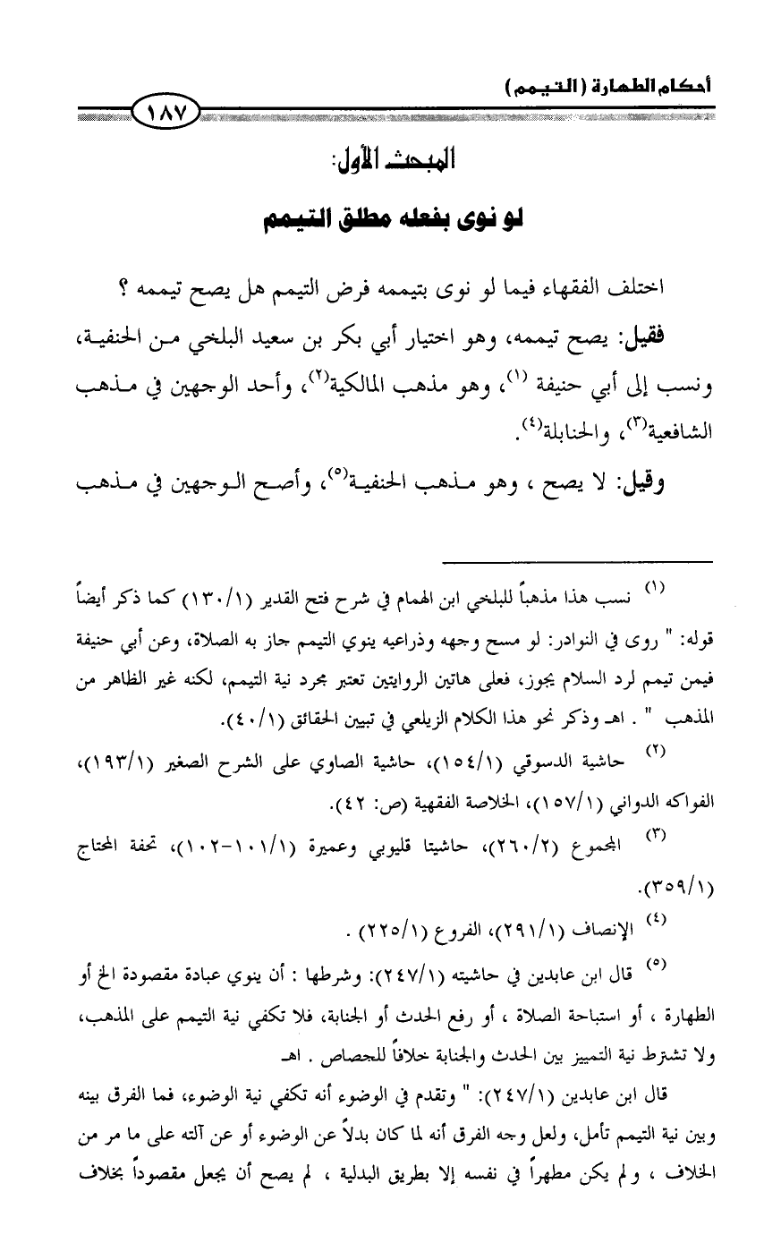 (¬1) نسب هذا مذهباً للبلخي ابن الهمام في شرح فتح القدير (1/ 130) كما ذكر أيضاً قوله: " روى في النوادر: لو مسح وجهه وذراعيه ينوي التيمم جاز به الصلاة، وعن أبي حنيفة فيمن تيمم لرد السلام يجوز، فعلى هاتين الروايتين تعتبر مجرد نية التيمم، لكنه غير الظاهر من المذهب ". اهـ وذكر نحو هذا الكلام الزيلعي في تبيين الحقائق (1/ 40).