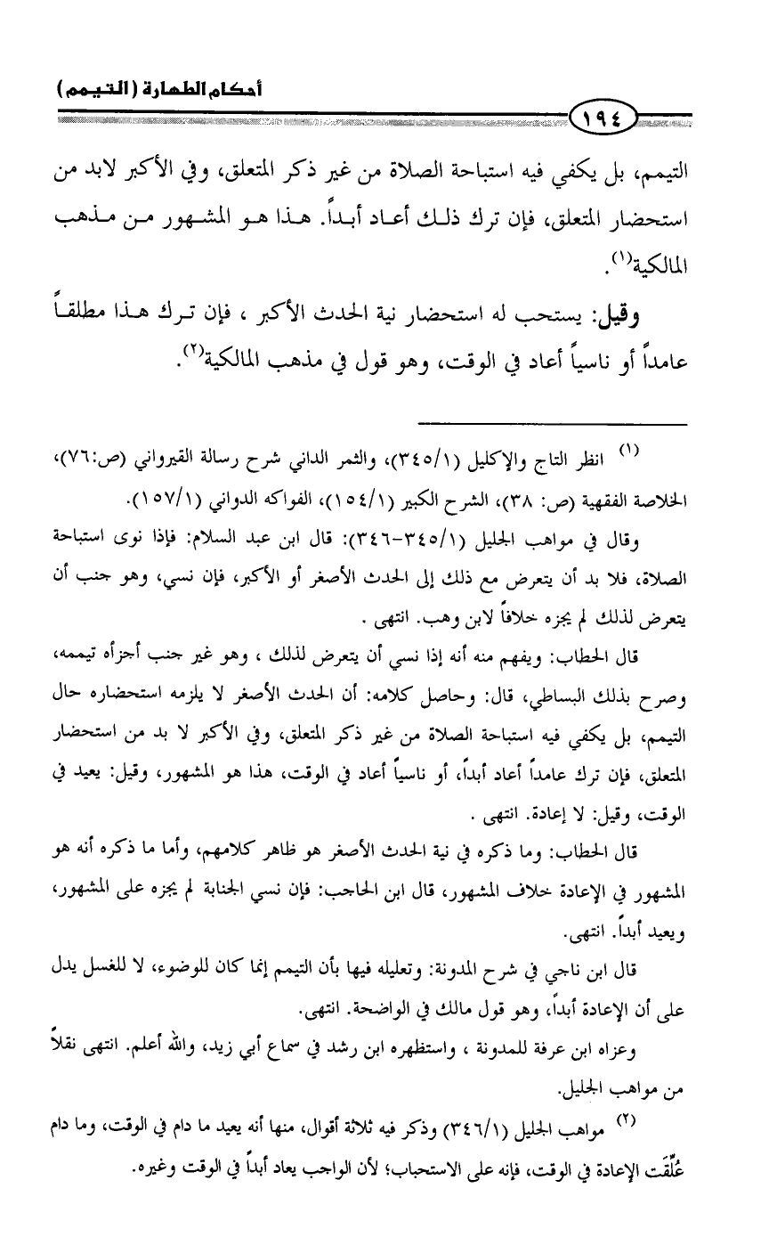 (¬1) انظر التاج والإكليل (1/ 345)، والثمر الداني شرح رسالة القيرواني (ص:76)، الخلاصة الفقهية (ص: 38)، الشرح الكبير (1/ 154)، الفواكه الدواني (1/ 157).