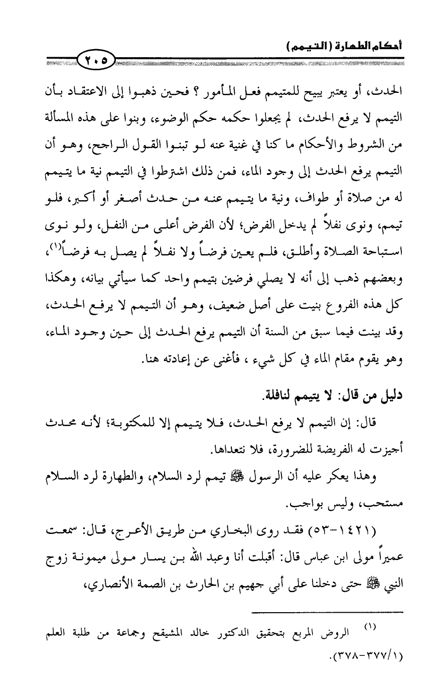 الحدث، أو يعتبر يبيح للمتيمم فعل المأمور؟ فحين ذهبوا إلى الاعتقاد بأن التيمم لا يرفع الحدث، لم يجعلوا حكمه حكم الوضوء، وبنوا على هذه المسألة من الشروط والأحكام ما كنا في غنية عنه لو تبنوا القول الراجح، وهو أن التيمم يرفع الحدث إلى وجود الماء، فمن ذلك اشترطوا في التيمم نية ما يتيمم له من صلاة أو طواف، ونية ما يتيمم عنه من حدث أصغر أو أكبر، فلو تيمم، ونوى نفلاً لم يدخل الفرض؛ لأن الفرض أعلى من النفل، ولو نوى استباحة الصلاة وأطلق، فلم يعين فرضاً ولا نفلاً لم يصل به فرضاً (¬1)، وبعضهم ذهب إلى أنه لا يصلي فرضين بتيمم واحد كما سيأتي بيانه، وهكذا كل هذه الفروع بنيت على أصل ضعيف، وهو أن التيمم لا يرفع الحدث، وقد بينت فيما سبق من السنة أن التيمم يرفع الحدث إلى حين وجود الماء، وهو يقوم مقام الماء في كل شيء، فأغنى عن إعادته هنا.