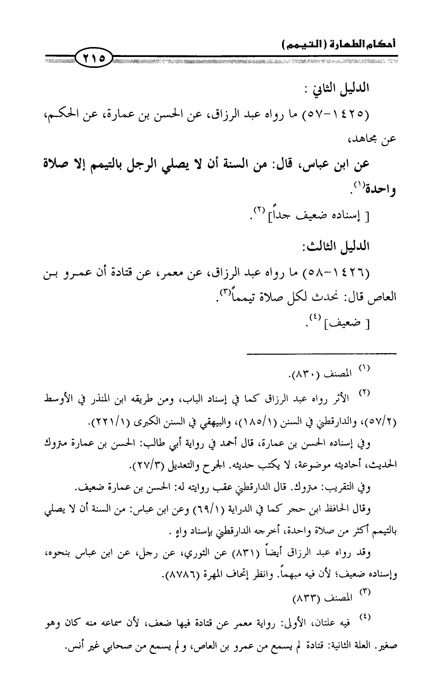 (1426 - 58) ما رواه عبد الرزاق، عن معمر، عن قتادة أن عمرو بن العاص قال: نحدث لكل صلاة تيمماً (¬3).