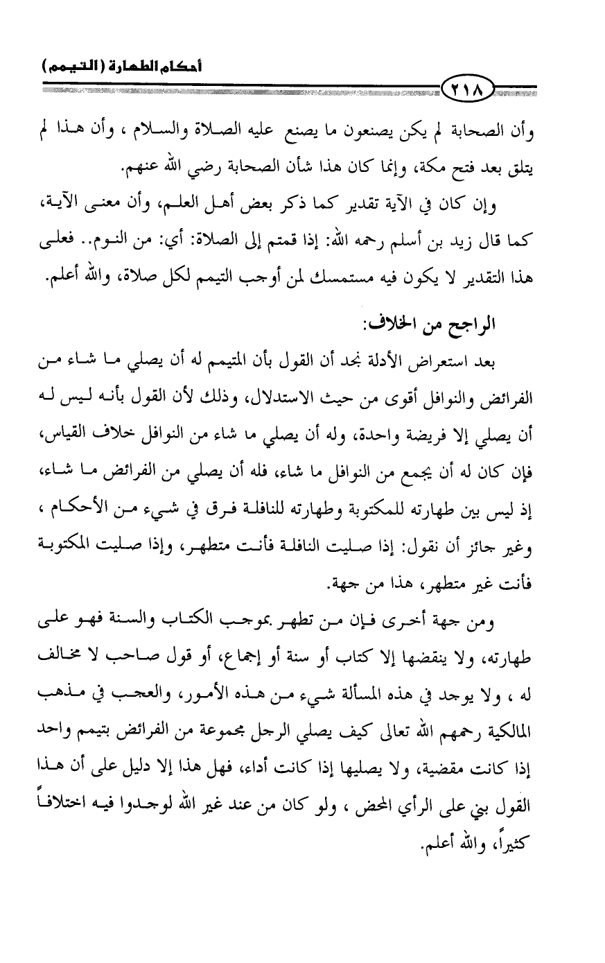 ومن جهة أخرى فإن من تطهر بموجب الكتاب والسنة فهو على طهارته، ولا ينقضها إلا كتاب أو سنة أو إجماع، أو قول صاحب لا مخالف له، ولا يوجد في هذه المسألة شيء من هذه الأمور، والعجب في مذهب المالكية رحمهم الله تعالى كيف يصلي الرجل مجموعة من الفرائض بتيمم واحد إذا كانت مقضية، ولا يصليها إذا كانت أداء، فهل هذا إلا دليل على أن هذا القول بني على الرأي المحض، ولو كان من عند غير الله لوجدوا فيه اختلافاً كثيراً، والله أعلم.