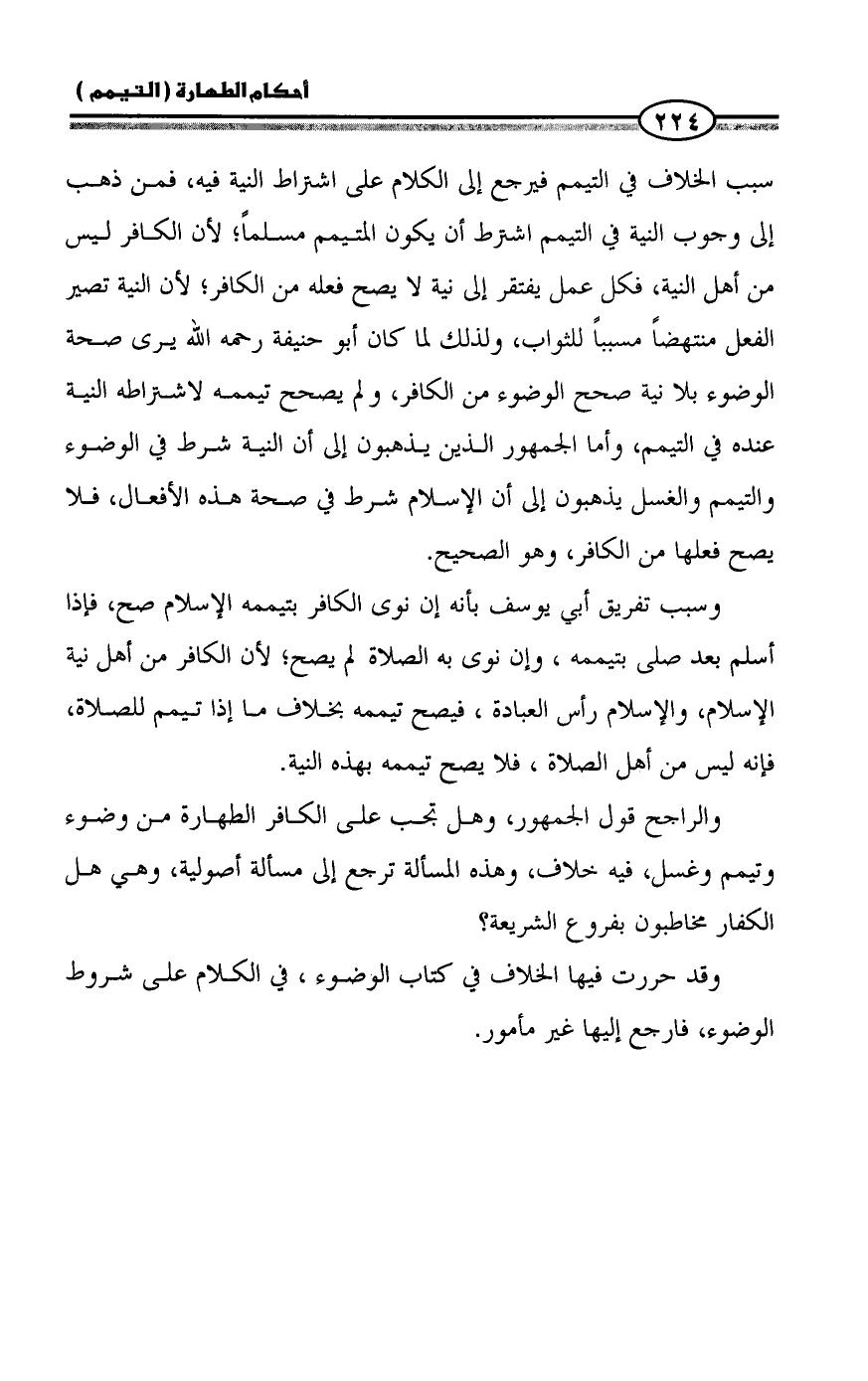 والراجح قول الجمهور، وهل تجب على الكافر الطهارة من وضوء وتيمم وغسل، فيه خلاف، وهذه المسألة ترجع إلى مسألة أصولية، وهي هل الكفار مخاطبون بفروع الشريعة؟