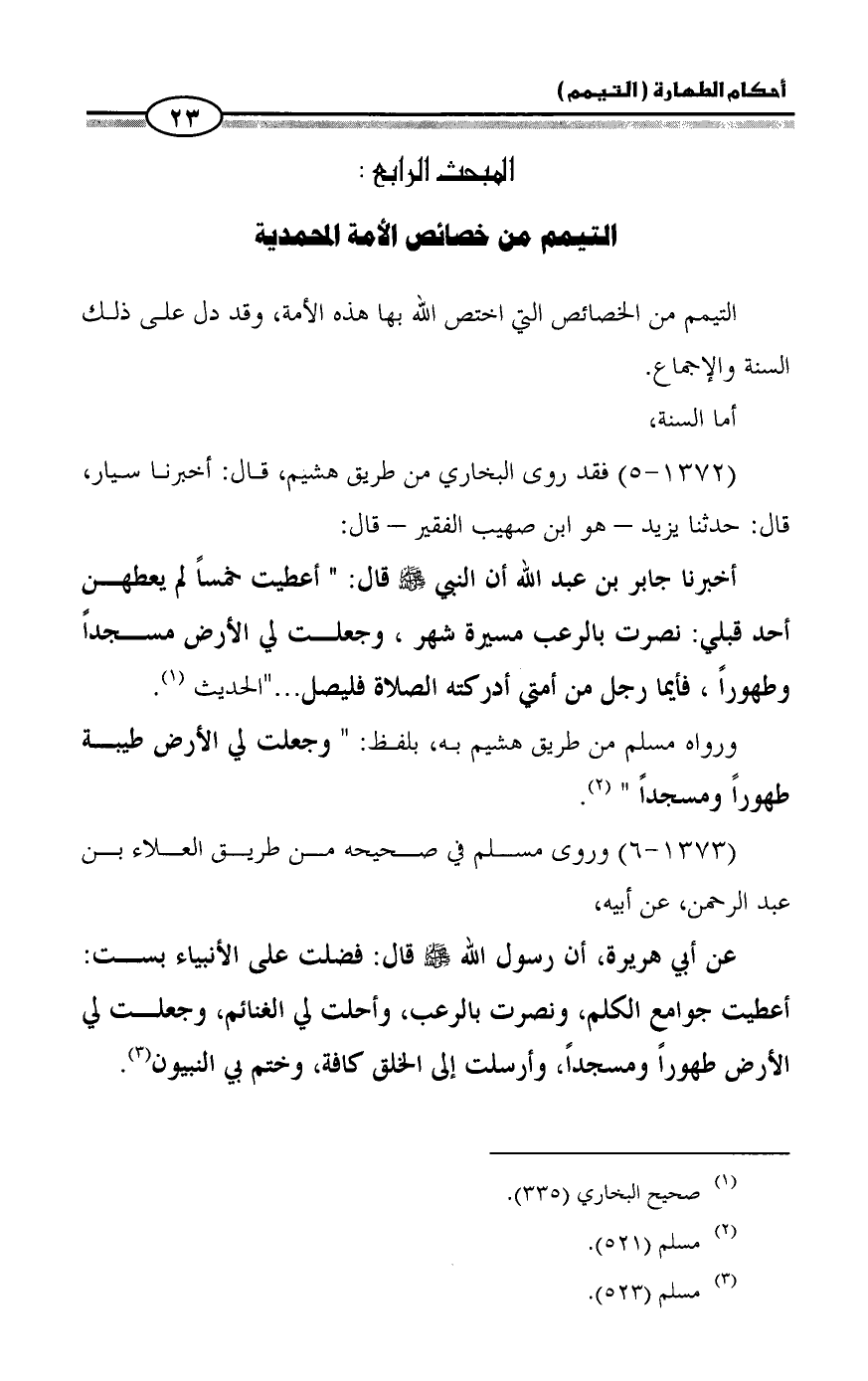 أخبرنا جابر بن عبد الله أن النبي - صلى الله عليه وسلم - قال: " أعطيت خمساً لم يعطهن أحد قبلي: نصرت بالرعب مسيرة شهر، وجعلت لي الأرض مسجداً وطهوراً، فأيما رجل من أمتي أدركته الصلاة فليصل ... "الحديث (¬1).