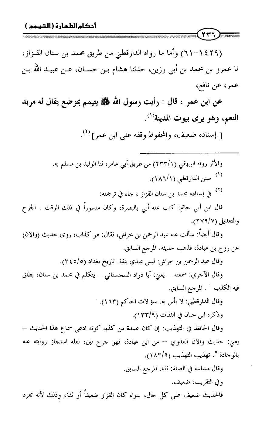 (1429 - 61) وأما ما رواه الدارقطني من طريق محمد بن سنان القزاز، نا عمرو بن محمد بن أبي رزين، حدثنا هشام بن حسان، عن عبيد الله بن عمر، عن نافع،