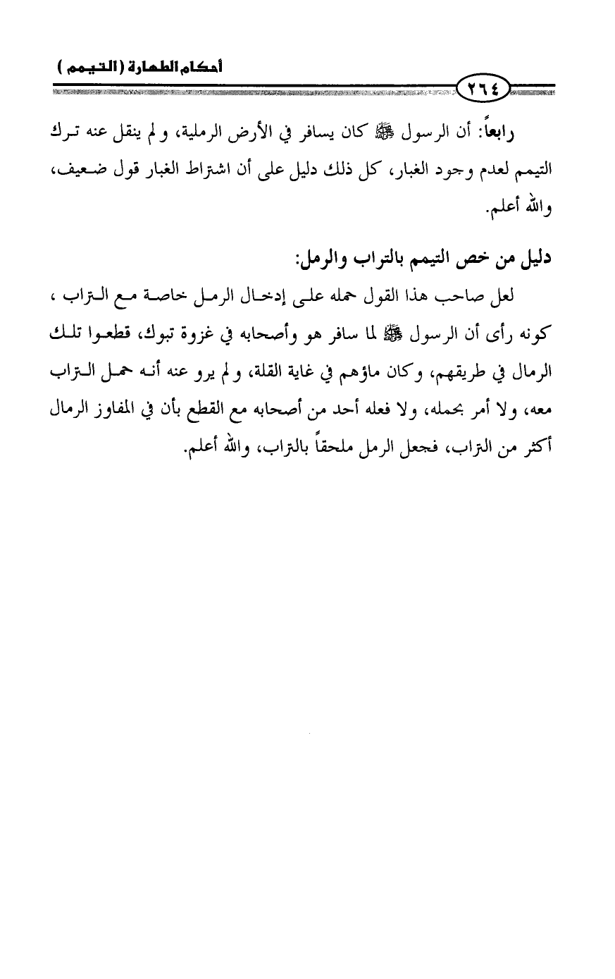 رابعاً: أن الرسول - صلى الله عليه وسلم - كان يسافر في الأرض الرملية، ولم ينقل عنه ترك التيمم لعدم وجود الغبار، كل ذلك دليل على أن اشتراط الغبار قول ضعيف، والله أعلم.