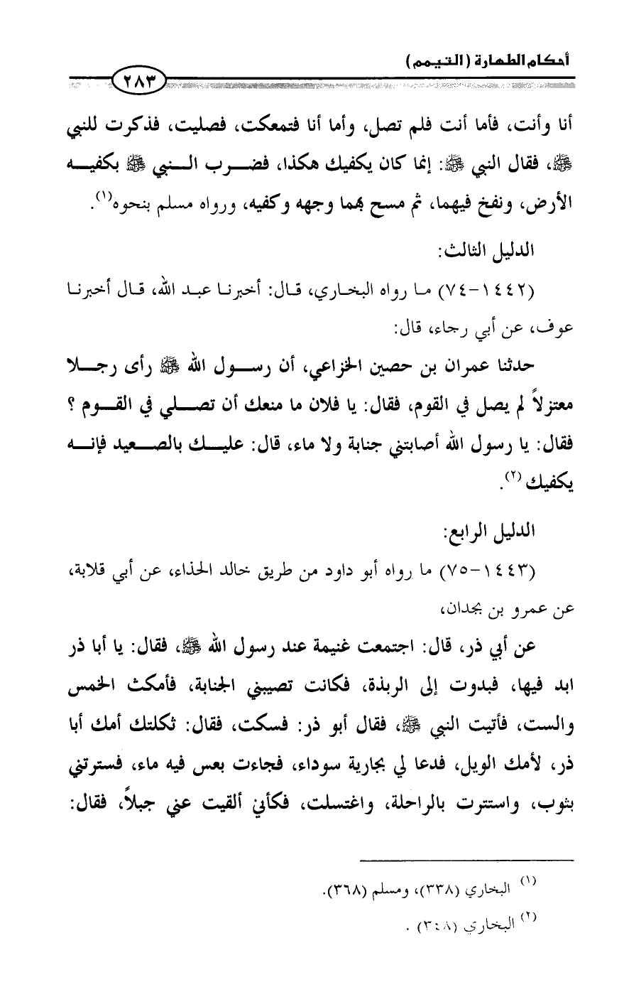 حدثنا عمران بن حصين الخزاعي، أن رسول الله - صلى الله عليه وسلم - رأى رجلا معتزلاً لم يصل في القوم، فقال: يا فلان ما منعك أن تصلي في القوم؟ فقال: يا رسول الله أصابتني جنابة ولا ماء، قال: عليك بالصعيد فإنه يكفيك (¬2).