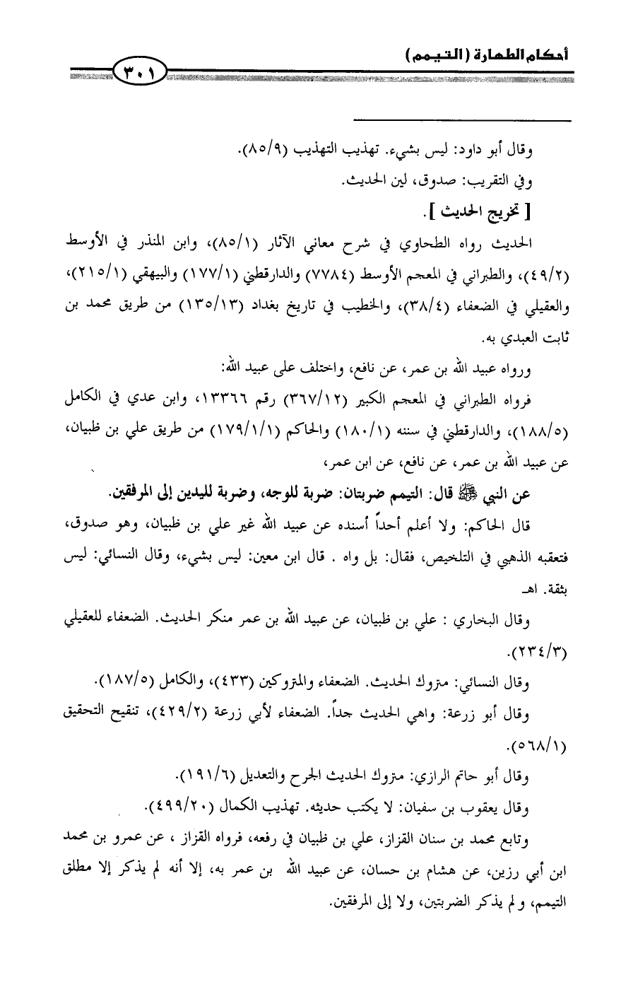 وتابع محمد بن سنان القزاز، علي بن ظبيان في رفعه، فرواه القزاز، عن عمرو بن محمد ابن أبي رزين، عن هشام بن حسان، عن عبيد الله بن عمر به، إلا أنه لم يذكر إلا مطلق التيمم، ولم يذكر الضربتين، ولا إلى المرفقين. =