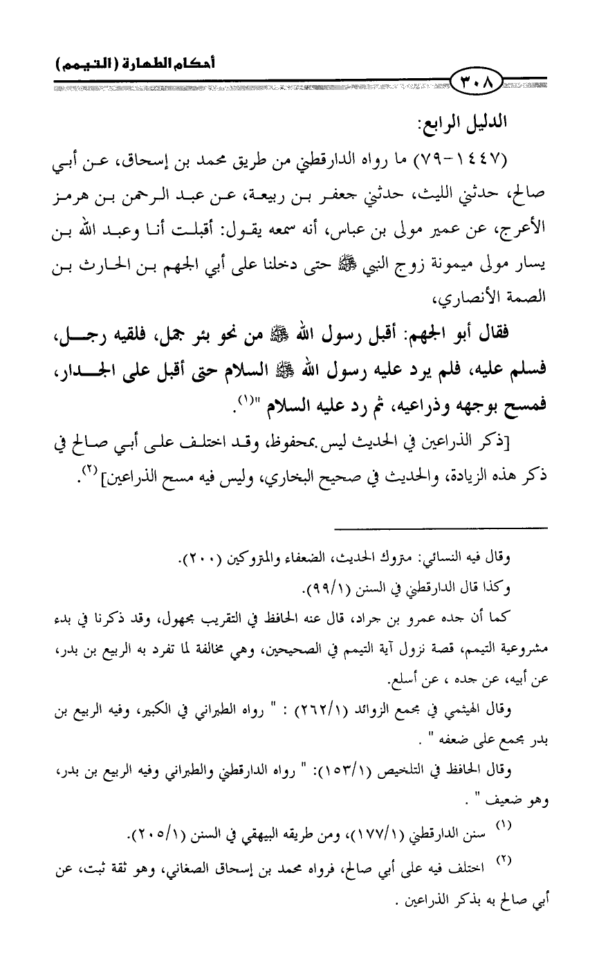 (1447 - 79) ما رواه الدارقطني من طريق محمد بن إسحاق، عن أبي صالح، حدثني الليث، حدثني جعفر بن ربيعة، عن عبد الرحمن بن هرمز الأعرج، عن عمير مولى بن عباس، أنه سمعه يقول: أقبلت أنا وعبد الله بن يسار مولى ميمونة زوج النبي - صلى الله عليه وسلم - حتى دخلنا على أبي الجهم بن الحارث بن الصمة الأنصاري،