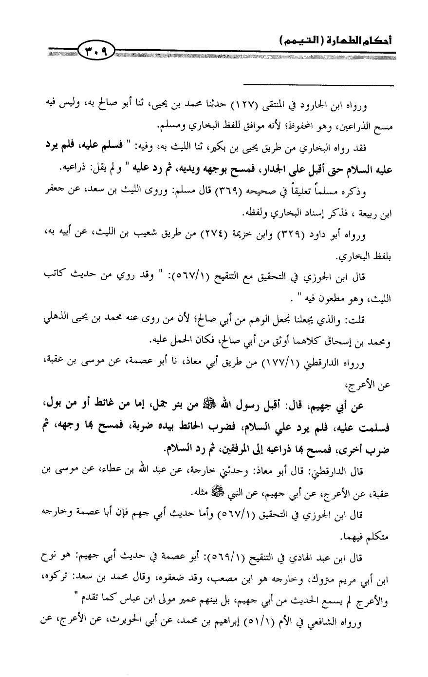 عن أبي جهيم، قال: أقبل رسول الله - صلى الله عليه وسلم - من بئر جمل، إما من غائط أو من بول، فسلمت عليه، فلم يرد علي السلام، فضرب الحائط بيده ضربة، فمسح بها وجهه، ثم ضرب أخرى، فمسح بها ذراعيه إلى المرفقين، ثم رد السلام.