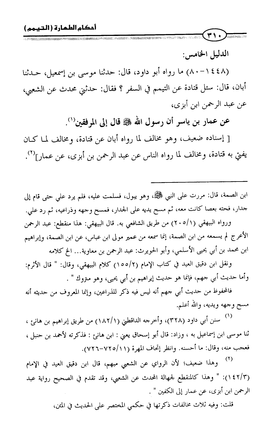 (¬2) وهذا ضعيف؛ لأن الرواي عن الشعبي مبهم، قال ابن دقيق العيد في الإمام (3/ 142): " وهذا كالمنقطع لجهالة المحدث عن الشعبي، وقد تقدم في الصحيح رواية عبد الرحمن ابن أبزى، عن عمار إلى الكفين ".