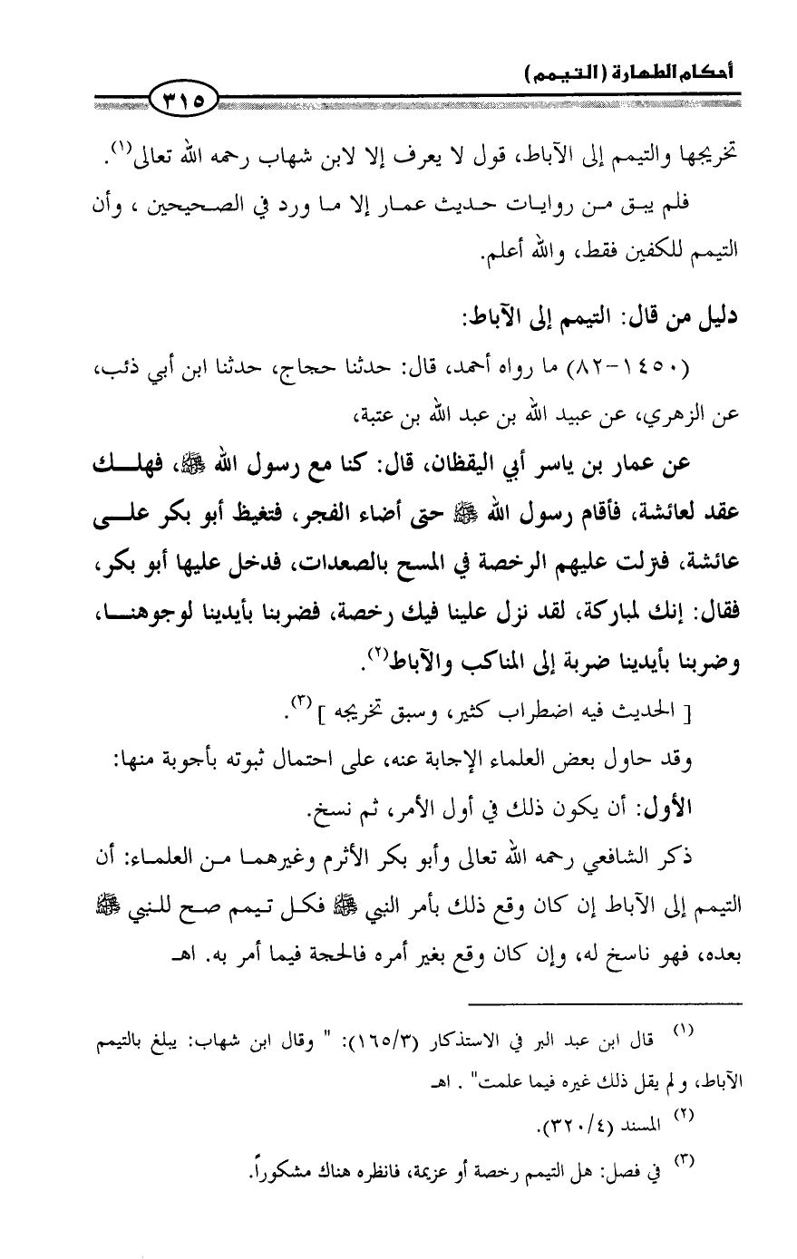 ذكر الشافعي رحمه الله تعالى وأبو بكر الأثرم وغيرهما من العلماء: أن التيمم إلى الآباط إن كان وقع ذلك بأمر النبي - صلى الله عليه وسلم - فكل تيمم صح للنبي - صلى الله عليه وسلم - بعده، فهو ناسخ له، وإن كان وقع بغير أمره فالحجة فيما أمر به. اهـ