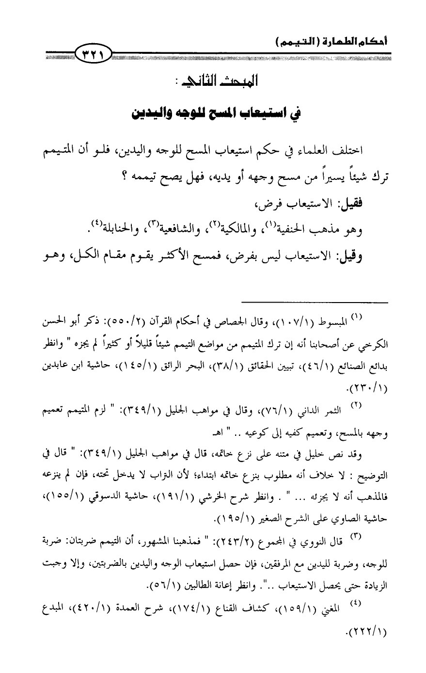 (¬1) المبسوط (1/ 107)، وقال الجصاص في أحكام القرآن (2/ 550): ذكر أبو الحسن الكرخي عن أصحابنا أنه إن ترك المتيمم من مواضع التيمم شيئاً قليلاً أو كثيراً لم يجزه " وانظر بدائع الصنائع (1/ 46)، تبيين الحقائق (1/ 38)، البحر الرائق (1/ 145)، حاشية ابن عابدين (1/ 230).