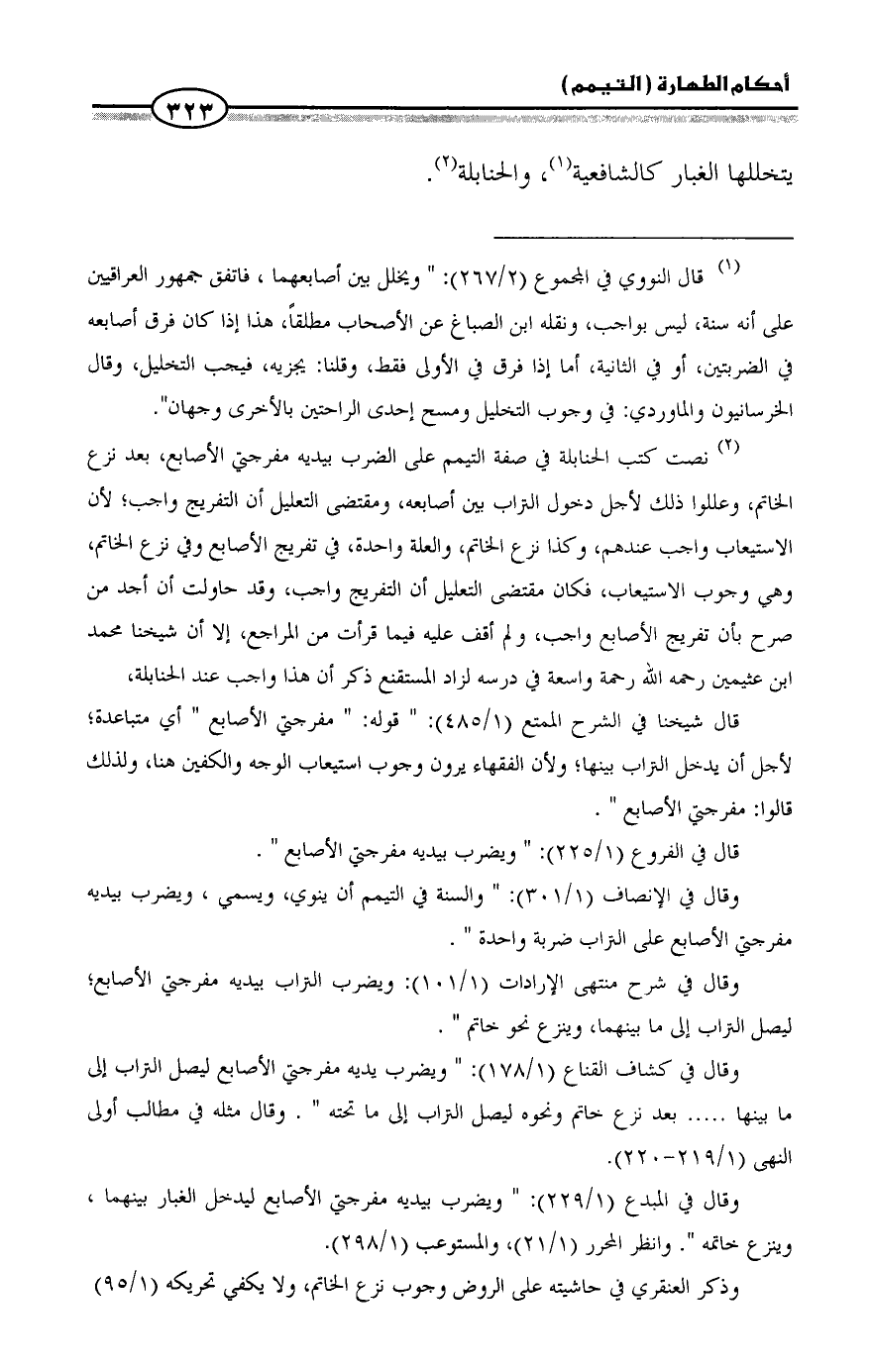 (¬2) نصت كتب الحنابلة في صفة التيمم على الضرب بيديه مفرجتي الأصابع، بعد نزع الخاتم، وعللوا ذلك لأجل دخول التراب بين أصابعه، ومقتضى التعليل أن التفريج واجب؛ لأن الاستيعاب واجب عندهم، وكذا نزع الخاتم، والعلة واحدة، في تفريج الأصابع وفي نزع الخاتم، وهي وجوب الاستيعاب، فكان مقتضى التعليل أن التفريج واجب، وقد حاولت أن أجد من صرح بأن تفريج الأصابع واجب، ولم أقف عليه فيما قرأت من المراجع، إلا أن شيخنا محمد ابن عثيمين رحمه الله رحمة واسعة في درسه لزاد المستقنع ذكر أن هذا واجب عند الحنابلة،