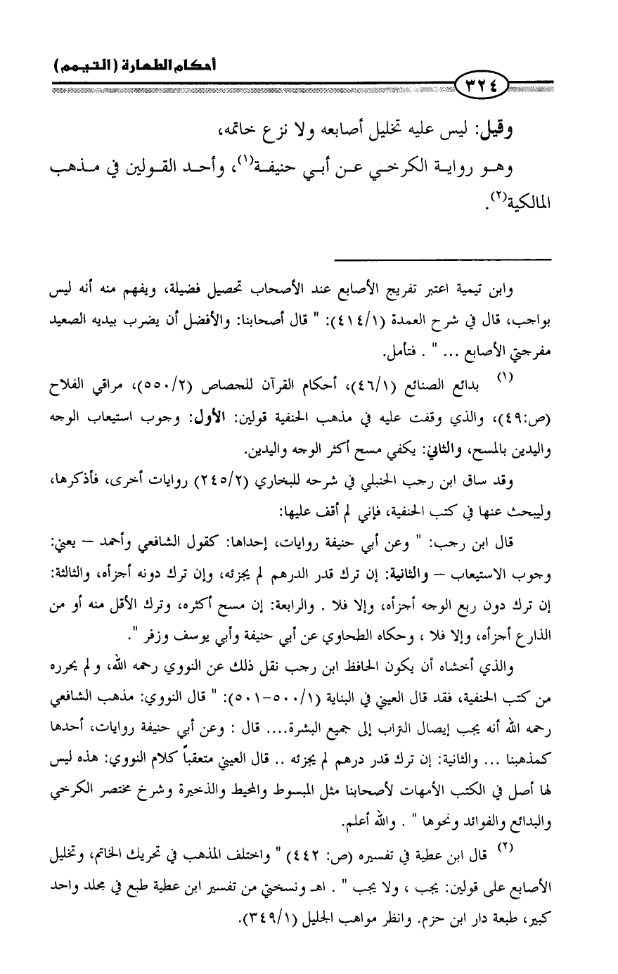 (¬2) قال ابن عطية في تفسيره (ص: 442) " واختلف المذهب في تحريك الخاتم، وتخليل الأصابع على قولين: يجب، ولا يجب ". اهـ ونسختي من تفسير ابن عطية طبع في مجلد واحد كبير، طبعة دار ابن حزم. وانظر مواهب الجليل (1/ 349).