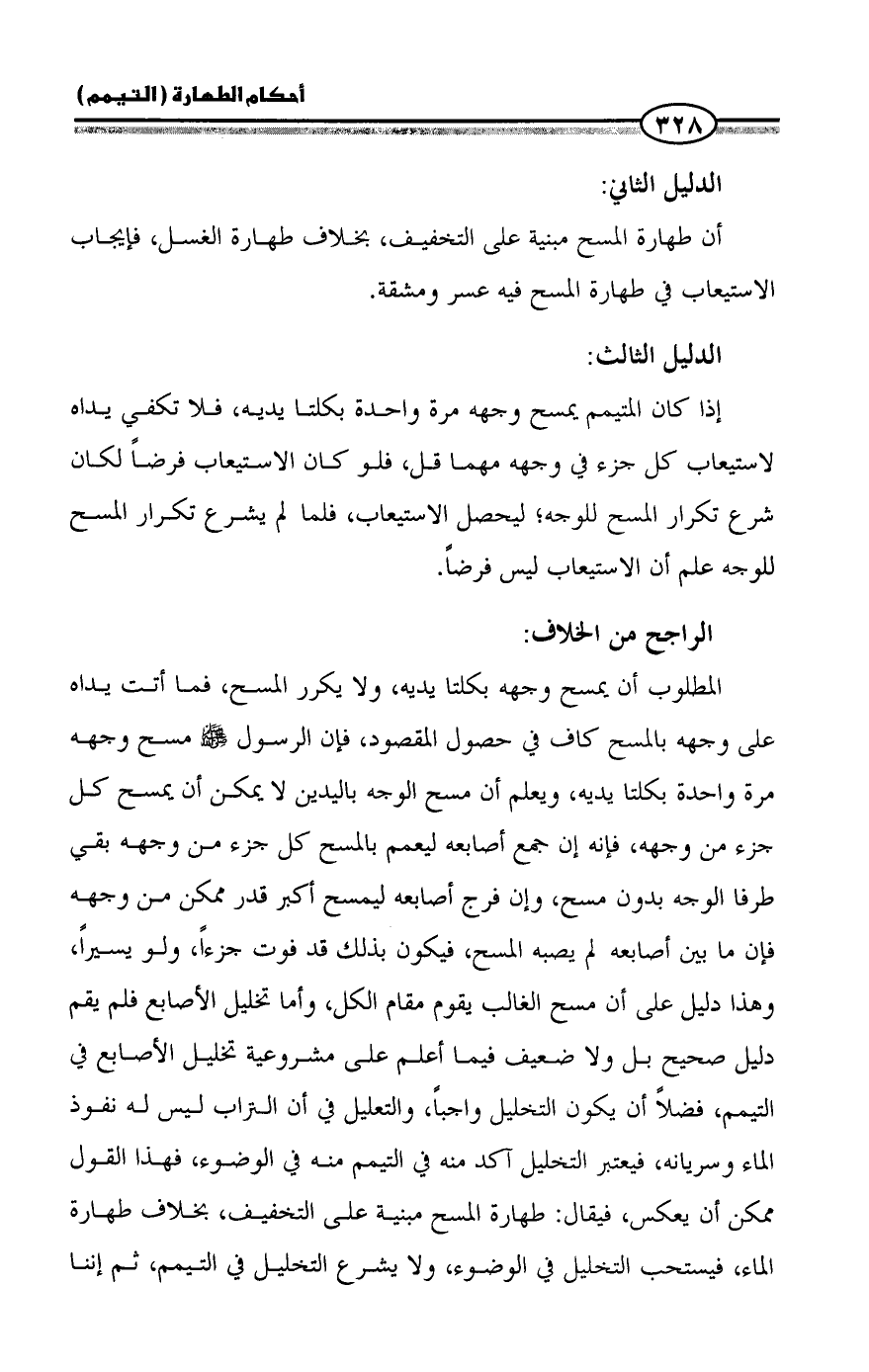 المطلوب أن يمسح وجهه بكلتا يديه، ولا يكرر المسح، فما أتت يداه على وجهه بالمسح كاف في حصول المقصود، فإن الرسول - صلى الله عليه وسلم - مسح وجهه مرة واحدة بكلتا يديه، ويعلم أن مسح الوجه باليدين لا يمكن أن يمسح كل جزء من وجهه، فإنه إن جمع أصابعه ليعمم بالمسح كل جزء من وجهه بقي طرفا الوجه بدون مسح، وإن فرج أصابعه ليمسح أكبر قدر ممكن من وجهه فإن ما بين أصابعه لم يصبه المسح، فيكون بذلك قد فوت جزءاً، ولو يسيراً، وهذا دليل على أن مسح الغالب يقوم مقام الكل، وأما تخليل الأصابع فلم يقم دليل صحيح بل ولا ضعيف فيما أعلم على مشروعية تخليل الأصابع في التيمم، فضلاً أن يكون التخليل واجباً، والتعليل في أن التراب ليس له نفوذ الماء وسريانه، فيعتبر التخليل آكد منه في التيمم منه في الوضوء، فهذا القول ممكن أن يعكس، فيقال: طهارة المسح مبنية على التخفيف، بخلاف طهارة الماء، فيستحب التخليل في الوضوء، ولا يشرع التخليل في التيمم، ثم إننا
