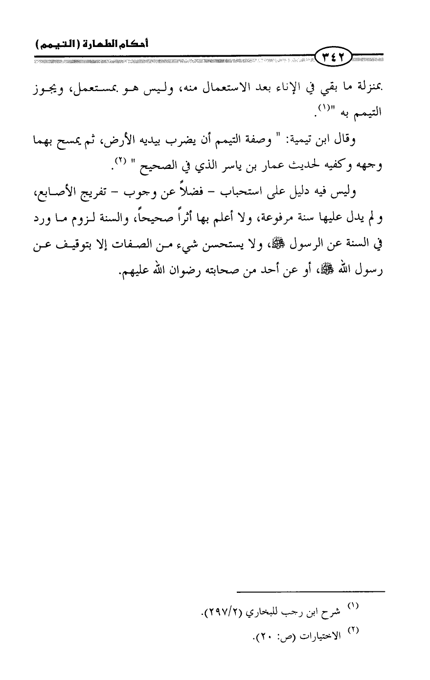 وقال ابن تيمية: " وصفة التيمم أن يضرب بيديه الأرض، ثم يمسح بهما وجهه وكفيه لحديث عمار بن ياسر الذي في الصحيح " (¬2).