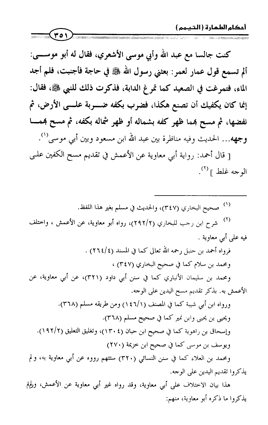 كنت جالسا مع عبد الله وأبي موسى الأشعري، فقال له أبو موسى: ألم تسمع قول عمار لعمر: بعثني رسول الله - صلى الله عليه وسلم - في حاجة فأجنبت، فلم أجد الماء، فتمرغت في الصعيد كما تمرغ الدابة، فذكرت ذلك للنبي - صلى الله عليه وسلم -، فقال: إنما كان يكفيك أن تصنع هكذا، فضرب بكفه ضربة على الأرض، ثم نفضها، ثم مسح بهما ظهر كفه بشماله أو ظهر شماله بكفه، ثم مسح بهما وجهه ... الحديث وفيه مناظرة بين عبد الله ابن مسعود وبين أبي موسى (¬1).