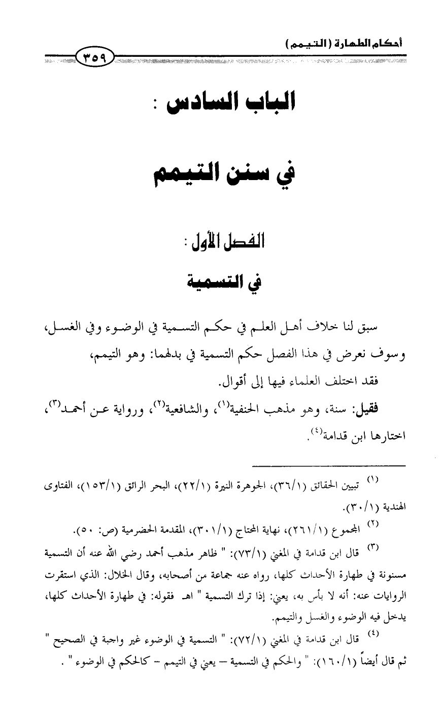 (¬4) قال ابن قدامة في المغني (1/ 72): " التسمية في الوضوء غير واجبة في الصحيح " ثم قال أيضاً (1/ 160): " والحكم في التسمية - يعني في التيمم - كالحكم في الوضوء ".