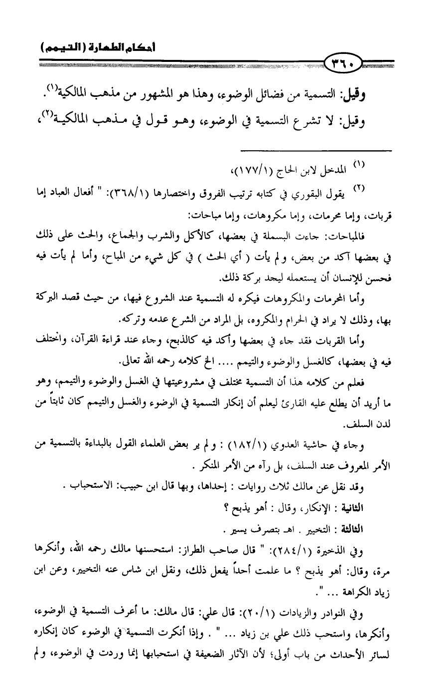 فعلم من كلامه هذا أن التسمية مختلف في مشروعيتها في الغسل والوضوء والتيمم، وهو ما أريد أن يطلع عليه القارئ ليعلم أن إنكار التسمية في الوضوء والغسل والتيمم كان ثابتاً من لدن السلف.