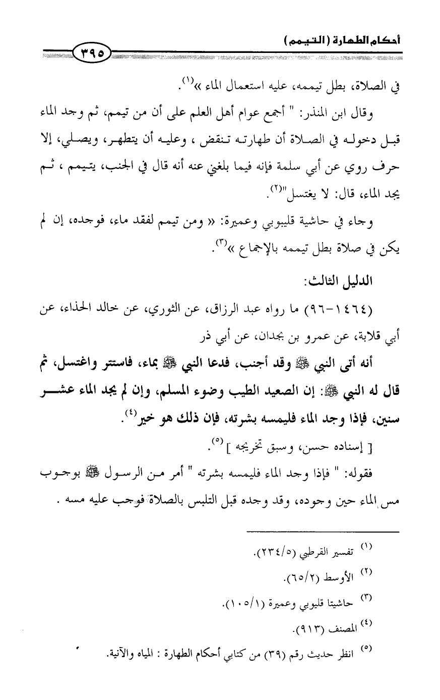أنه أتى النبي - صلى الله عليه وسلم - وقد أجنب، فدعا النبي - صلى الله عليه وسلم - بماء، فاستتر واغتسل، ثم قال له النبي - صلى الله عليه وسلم -: إن الصعيد الطيب وضوء المسلم، وإن لم يجد الماء عشر سنين، فإذا وجد الماء فليمسه بشرته، فإن ذلك هو خير (¬4).