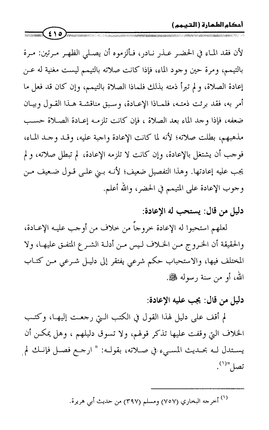 لأن فقد الماء في الحضر عذر نادر، فألزموه أن يصلي الظهر مرتين: مرة بالتيمم، ومرة حين وجود الماء، فإذا كانت صلاته بالتيمم ليست مغنية له عن إعادة الصلاة، ولم تبرأ ذمته بذلك فلماذا الصلاة بالتيمم، وإن كان قد فعل ما أمر به، فقد برئت ذمته، فلماذا الإعادة، وسبق مناقشة هذا القول وبيان ضعفه، فإذا وجد الماء بعد الصلاة، فإن كانت تلزمه إعادة الصلاة حسب مذهبهم، بطلت صلاته؛ لأنه لما كانت الإعادة واجبة عليه، وقد وجد الماء، فوجب أن يشتغل بالإعادة، وإن كانت لا تلزمه الإعادة، لم تبطل صلاته، ولم يجب عليه إعادتها. وهذا التفصيل ضعيف؛ لأنه بني على قول ضعيف من وجوب الإعادة على المتيمم في الحضر، والله أعلم.