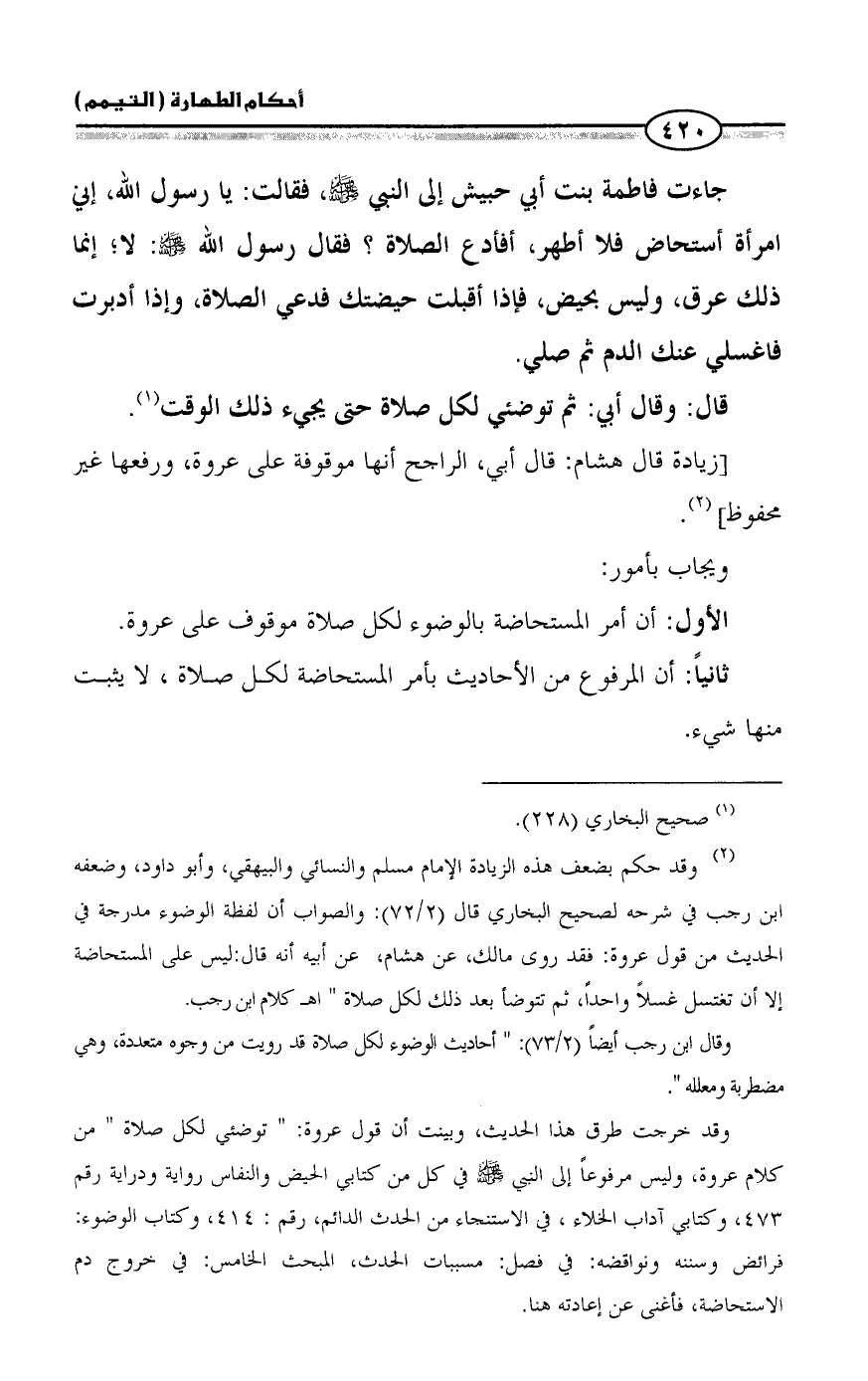 (¬2) وقد حكم بضعف هذه الزيادة الإمام مسلم والنسائي والبيهقي، وأبو داود، وضعفه ابن رجب في شرحه لصحيح البخاري قال (2/ 72): والصواب أن لفظة الوضوء مدرجة في الحديث من قول عروة: فقد روى مالك، عن هشام، عن أبيه أنه قال: ليس على المستحاضة إلا أن تغتسل غسلاً واحداً، ثم تتوضأ بعد ذلك لكل صلاة " اهـ كلام ابن رجب.