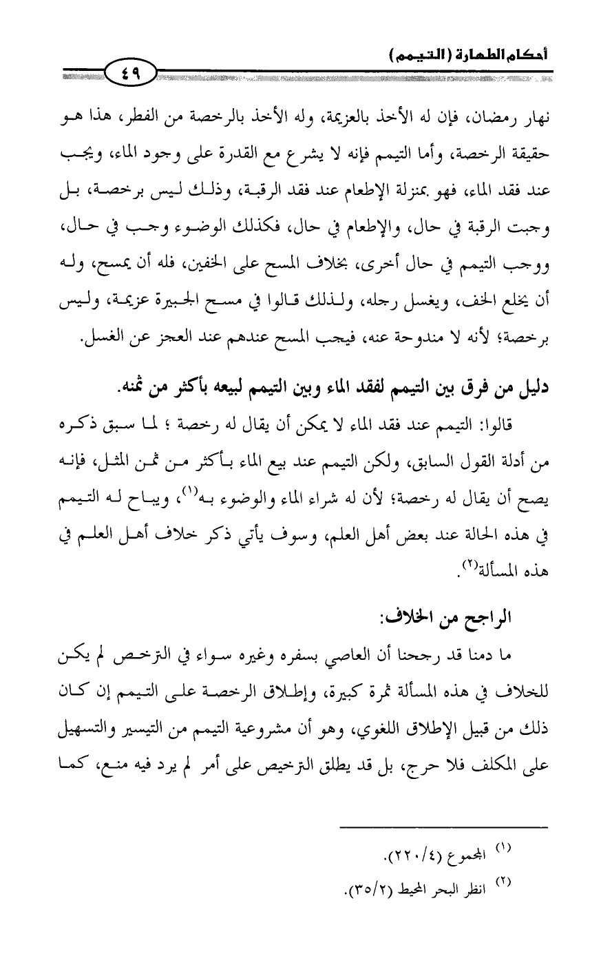 نهار رمضان، فإن له الأخذ بالعزيمة، وله الأخذ بالرخصة من الفطر، هذا هو حقيقة الرخصة، وأما التيمم فإنه لا يشرع مع القدرة على وجود الماء، ويجب عند فقد الماء، فهو بمنزلة الإطعام عند فقد الرقبة، وذلك ليس برخصة، بل وجبت الرقبة في حال، والإطعام في حال، فكذلك الوضوء وجب في حال، ووجب التيمم في حال أخرى، بخلاف المسح على الخفين، فله أن يمسح، وله أن يخلع الخف، ويغسل رجله، ولذلك قالوا في مسح الجبيرة عزيمة، وليس برخصة؛ لأنه لا مندوحة عنه، فيجب المسح عندهم عند العجز عن الغسل.