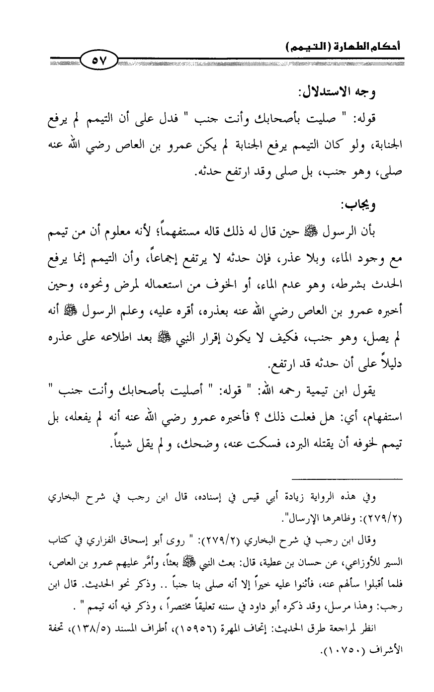 يقول ابن تيمية رحمه الله: " قوله: " أصليت بأصحابك وأنت جنب " استفهام، أي: هل فعلت ذلك؟ فأخبره عمرو رضي الله عنه أنه لم يفعله، بل تيمم لخوفه أن يقتله البرد، فسكت عنه، وضحك، ولم يقل شيئاً.