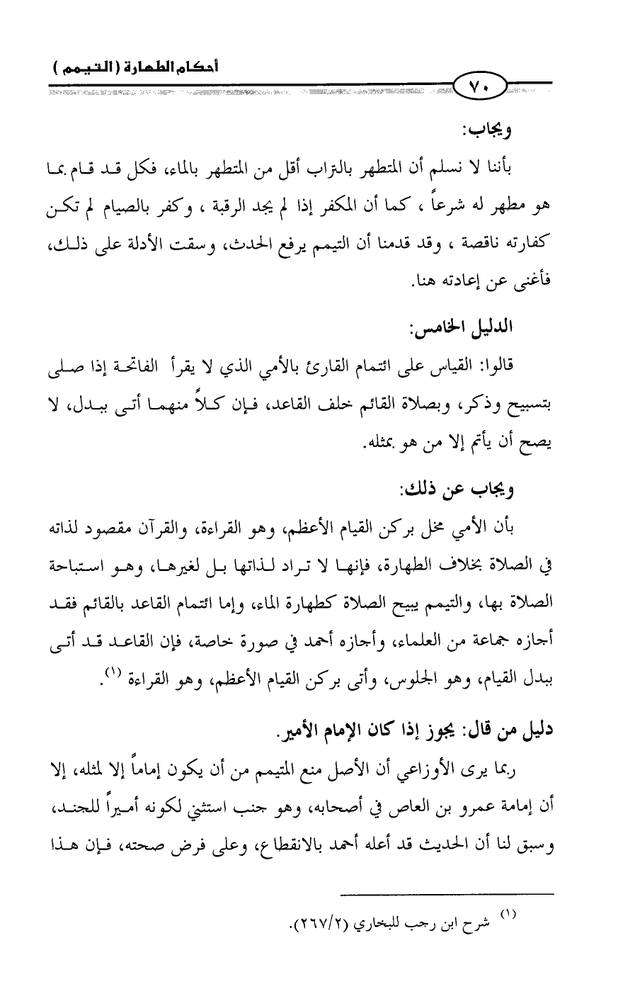 بأن الأمي مخل بركن القيام الأعظم، وهو القراءة، والقرآن مقصود لذاته في الصلاة بخلاف الطهارة، فإنها لا تراد لذاتها بل لغيرها، وهو استباحة الصلاة بها، والتيمم يبيح الصلاة كطهارة الماء، وإما ائتمام القاعد بالقائم فقد أجازه جماعة من العلماء، وأجازه أحمد في صورة خاصة، فإن القاعد قد أتى ببدل القيام، وهو الجلوس، وأتى بركن القيام الأعظم، وهو القراءة (¬1).